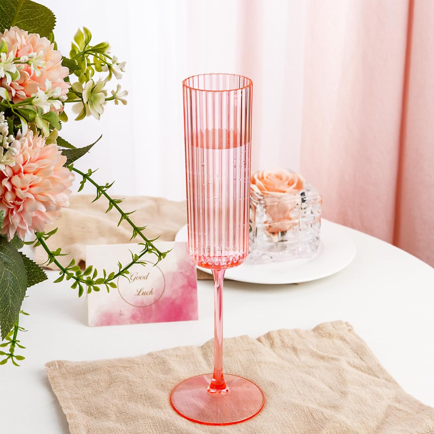 - 24-Pack Set with Great Value: Each set of plastic champagne flutes contains 24 exquisite ribbed champagne plastic glasses, with a capacity of 6 ounces per flute. Whether you're hosting a grand social gathering, a romantic wedding celebration, or a joyous holiday party, these pink plastic champagne glasses can fully meet your needs and provide you with a cost-effective party supplies solution.