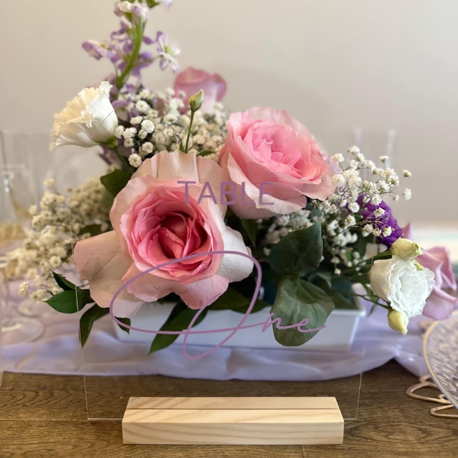 - Clear Acrylic Sign with Wood Base: The glass-like acrylic material is a trendy choice for wedding party decorations. These elegant acrylic wedding table signs will enhance the aesthetic of any table and complement various wedding styles, from rustic to timeless and classic.