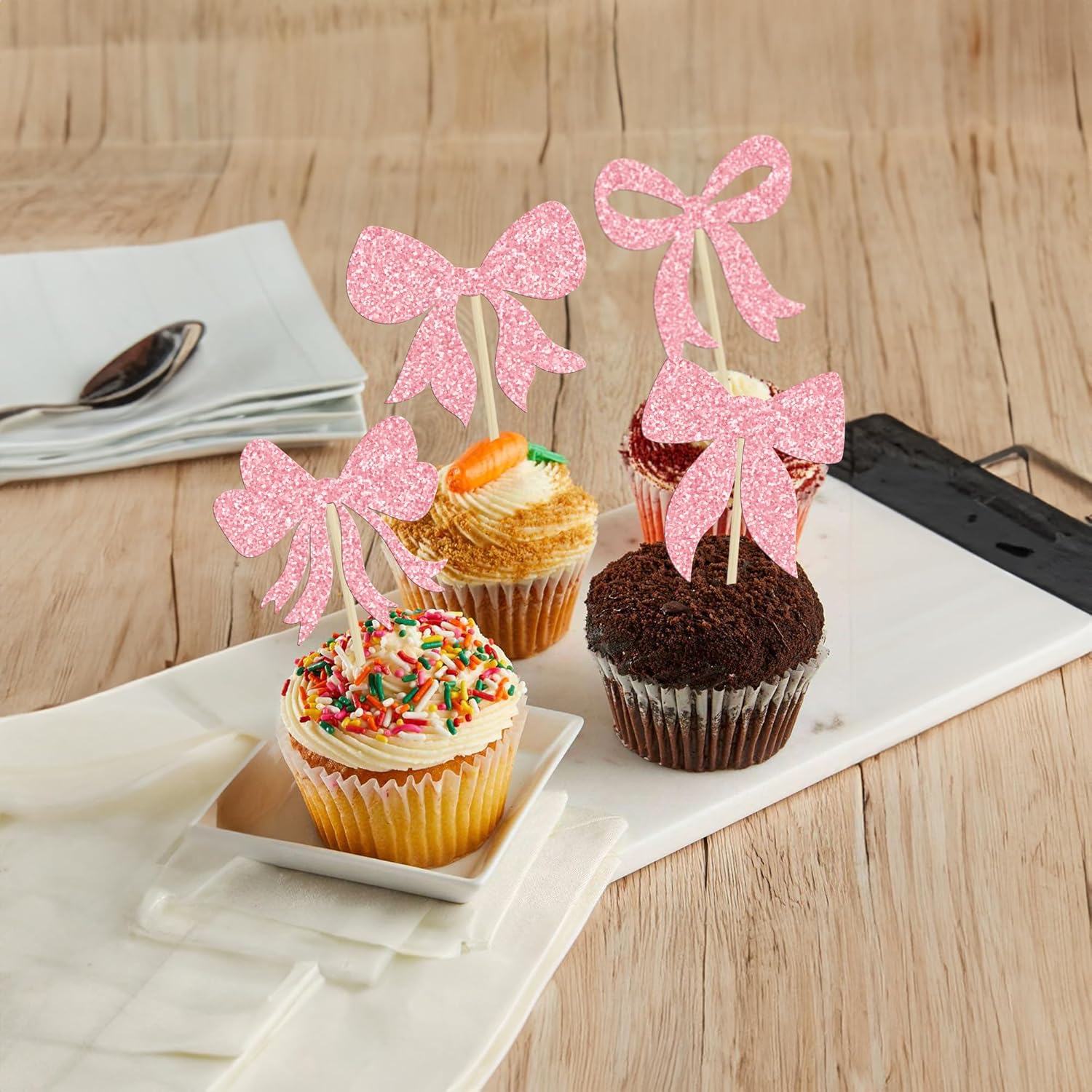 Gyufise 36Pcs Bow Cupcake Toppers Glitter Girls Birthday Decorations Bowknot Cupcake Picks Bow Tie Birthday Decorations Bow Cake Toppers for Bridal Baby Shower Bachelorette Party Supplies Pink