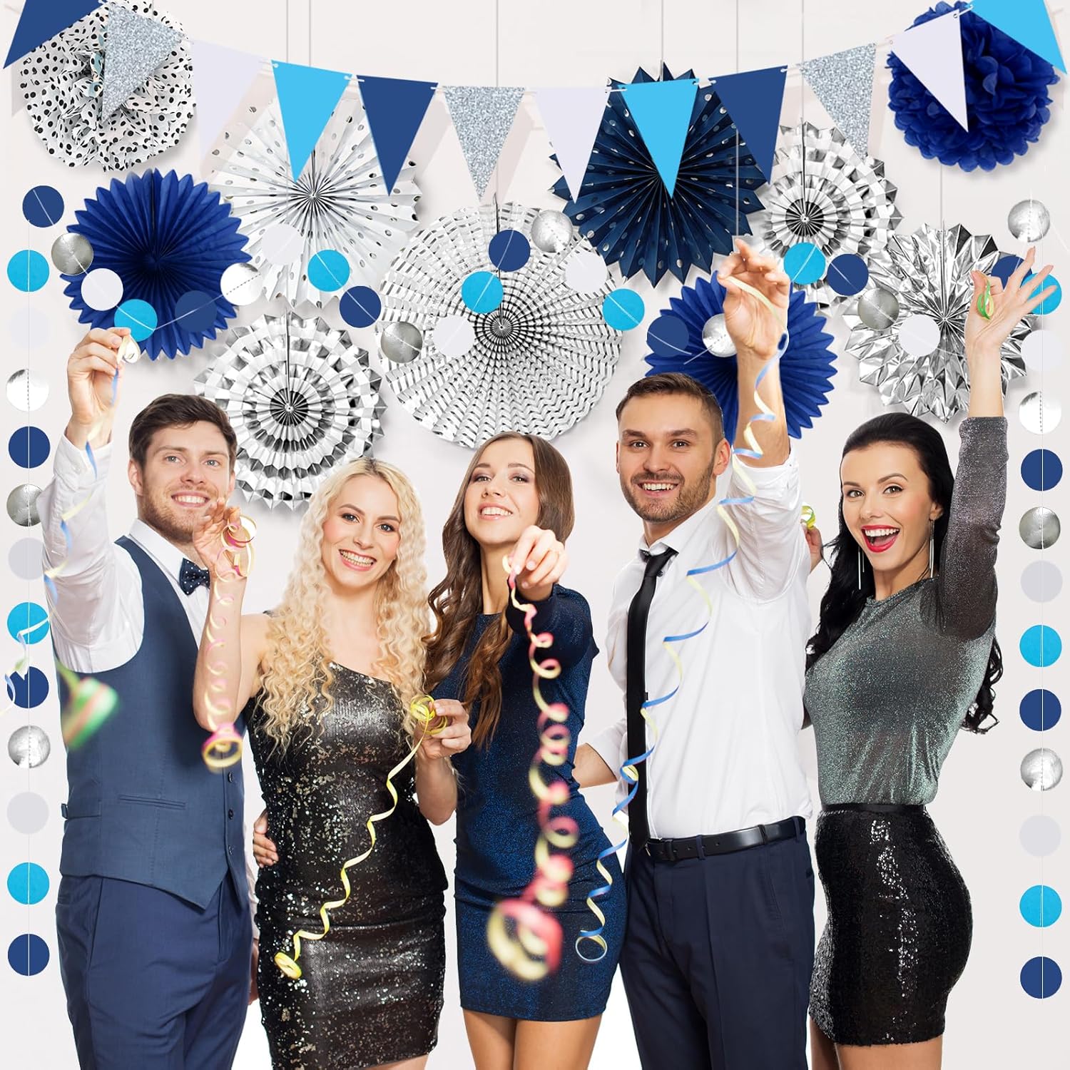 - 【Package Included】You will get 2 x 12-inch polka dot paper fans, 2 x 10-inch silver hoop paper fans, 2 x10-inch blue paper fans, 1 x10-inch silver paper fan, 1 x16-inch silver paper fan, 2 x10-inch paper flower balls, 6 hanging swirls, 9-foot garland with 40 dots, 8.2-foot banner, 12 flags, 20 x13.8-inch tassels, these props will create the perfect atmosphere for your party and make the party full of fun