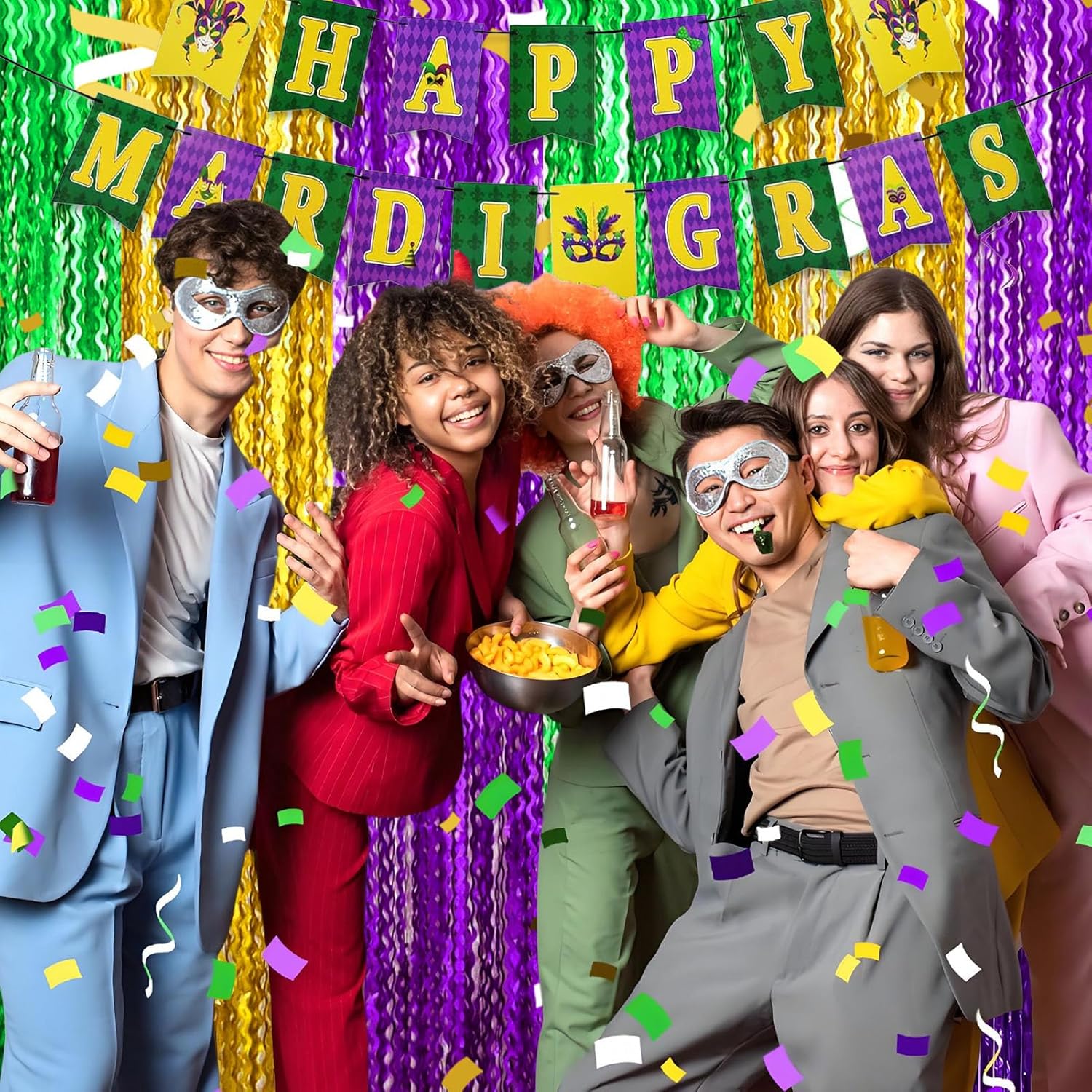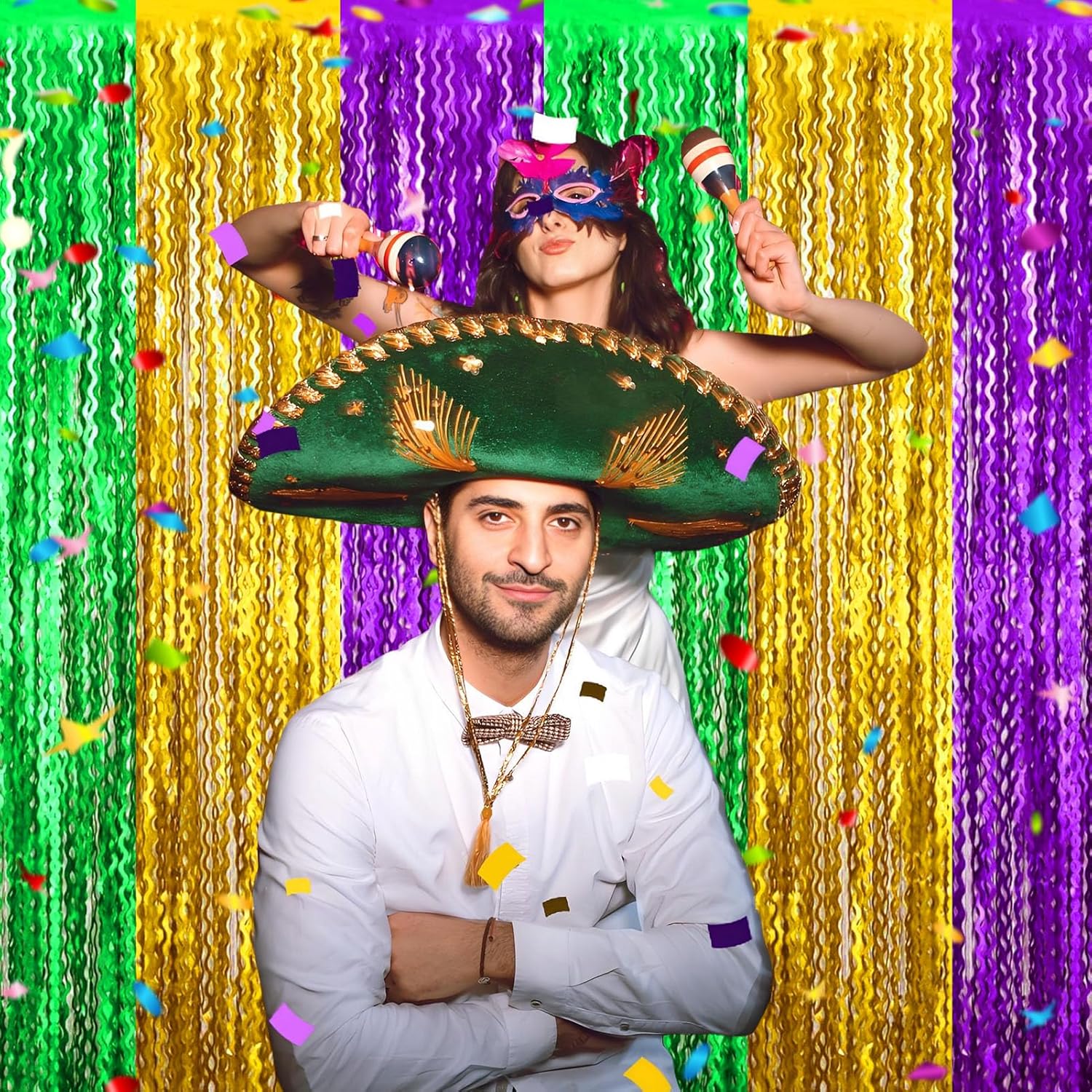 4 Pack Gold Green Purple Wave Foil Fringe Curtain Backdrop, 3.28Ft x 8.2Ft Metallic Tinsel Foil Fringe Streamer Curtains for Photo Booth, Mother's Day, Easter, Birthday, Wedding Party Decoration
