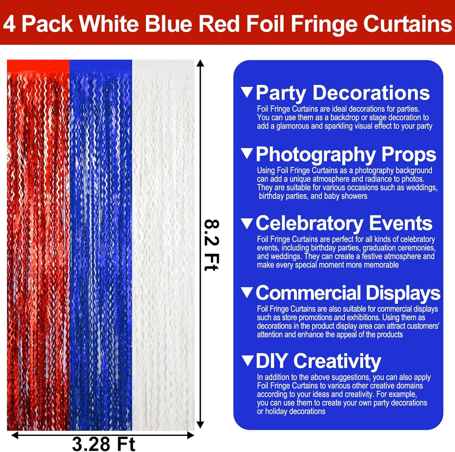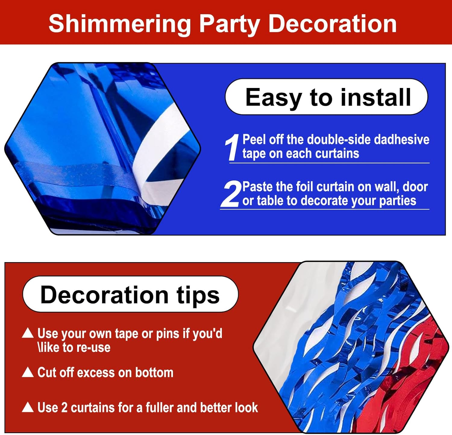 - Easy To Assemble | Strong Adhesive | Not Easy Fade : The foil fringe curtain backdrop party decorations come with double-sided adhesive tape, easy to use, just tear off the back of adhesive tape, then paste this streamers backdrop curtains on the top of wall, window, table, or as door fringe decoration.