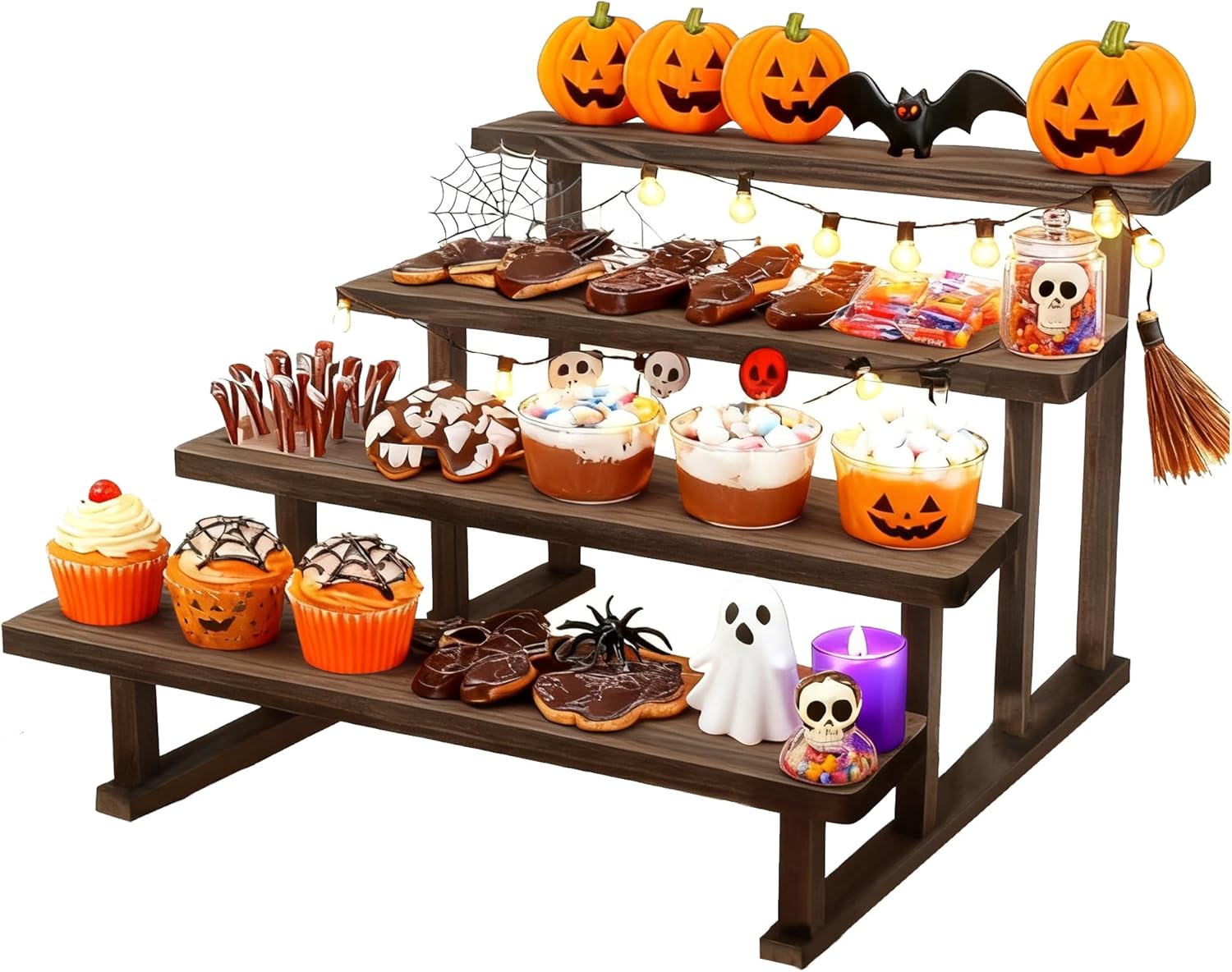 - STYLISH & EFFICIENT STEPS DESIGN: The 4-tier display shelf features a stepped wood design that easily expands storage space, displays layers at a glance, is easy to access, complements any decor, and provides an elegant solution for displaying your favorite items.