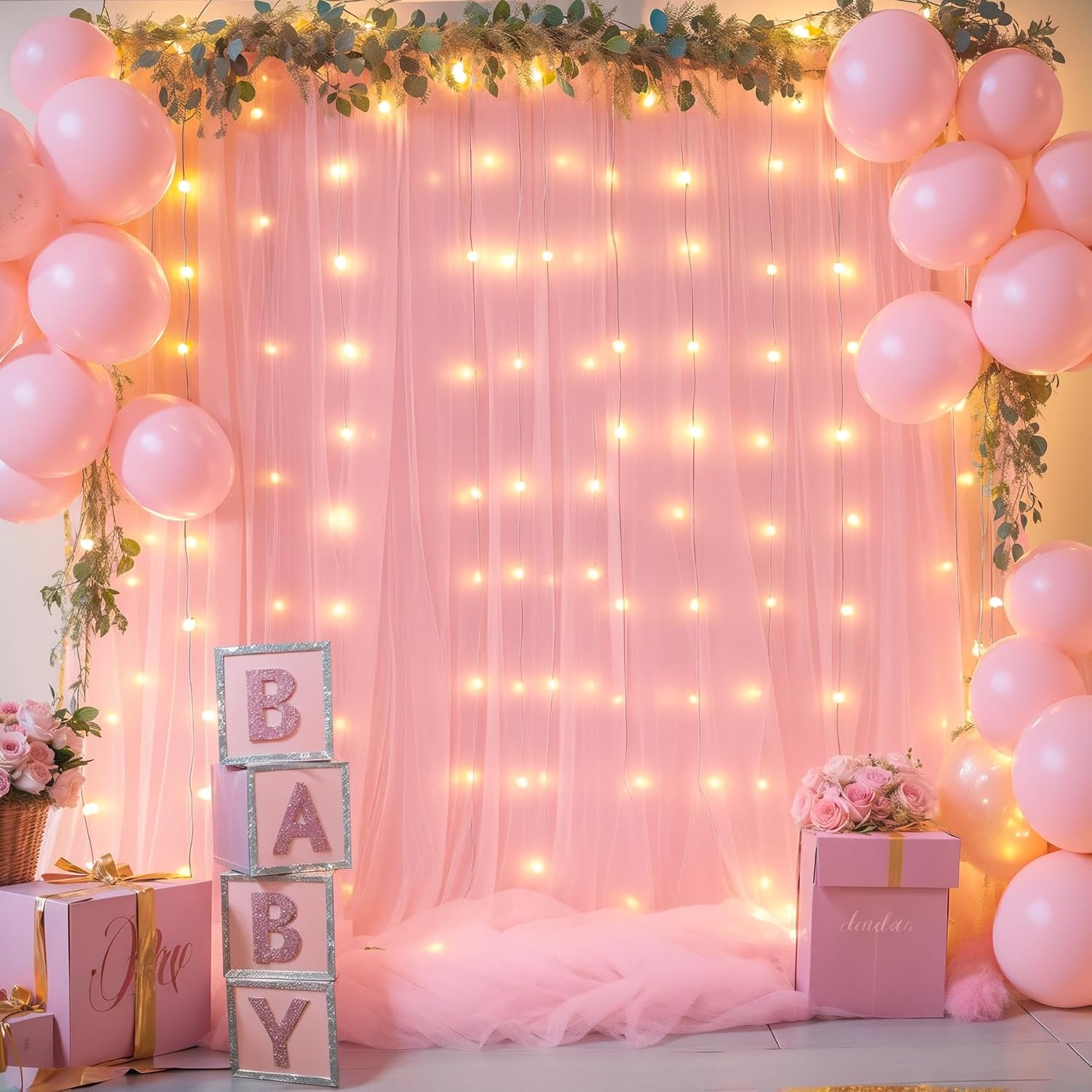 - Pink Sheer Backdrop Curtain with Lights Occasions: Perfect for weddings, baby showers, bridal showers, birthday parties, anniversaries, New Year celebrations, family gatherings, and other occasions to create a memorable photo backdrop. The tulle backdrop curtains can be reused many times. For a fuller effect, consider purchasing multiple sets to use together