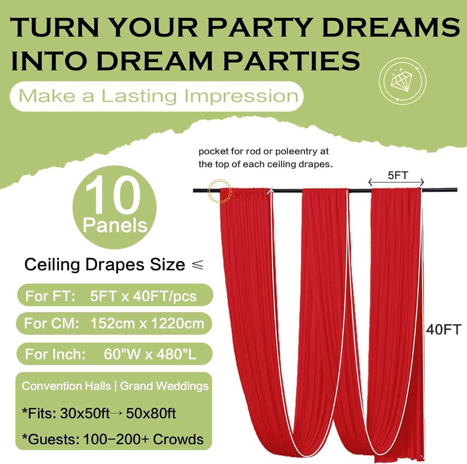 - 40ft Extra Long Ceiling Drapes: 10 Panels 5ftx40ft Red Backdrop Curtains for Parties. Totally 50FT(Width) x 40FT(Height). cortinas para fiestas decoracion.