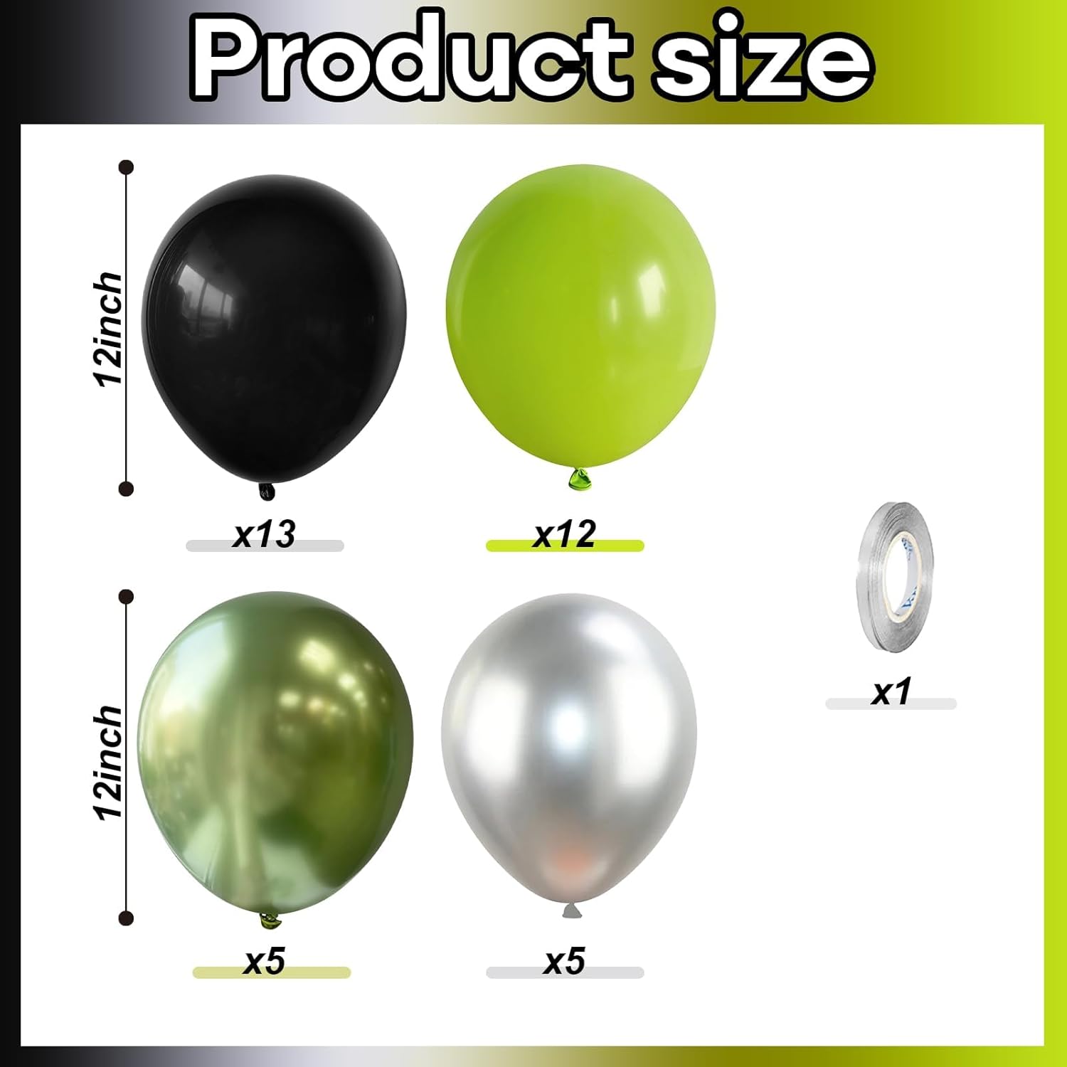 - Party Balloons Set: The video game balloons set have 35pcs 12 inch helium balloons, include 12pcs lime green balloons, 13pcs black balloons, 5pcs metallic light green balloons, 5pcs chrome metallic silver balloons, 1pc silver balloon ribbon.