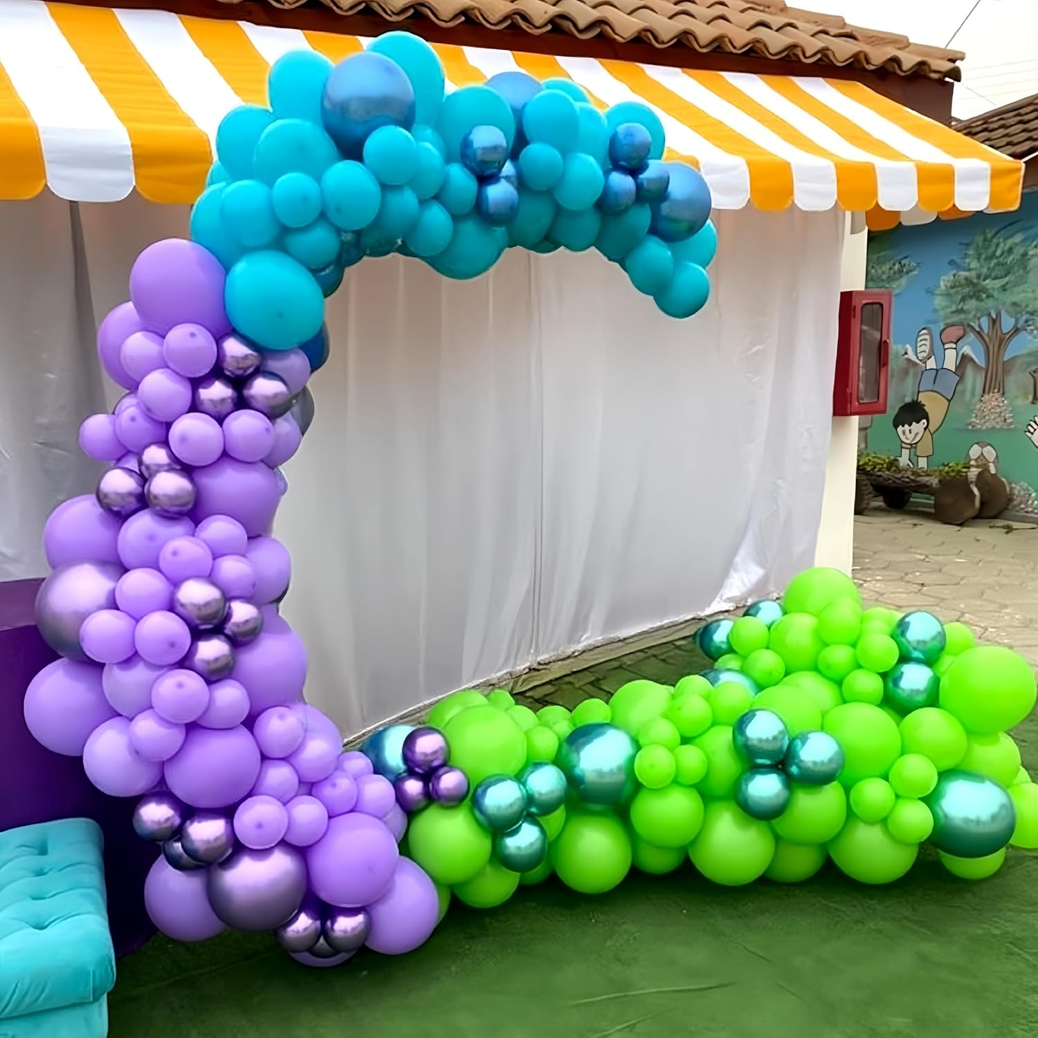 - Party Balloons Set: The purple pink balloons kit have 60pcs 12inch helium balloons, include 10pcs purple balloons, 10pcs pastel pink balloons, 12pcs teal balloons, 13pcs neon green balloons, 7pcs chrome purple balloons, 8pcs clear ballons, 2pcs balloon ribbon (purple, bright green).