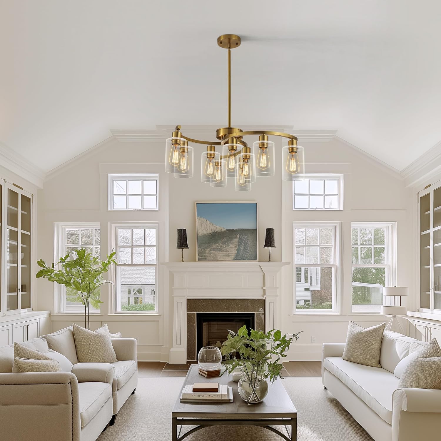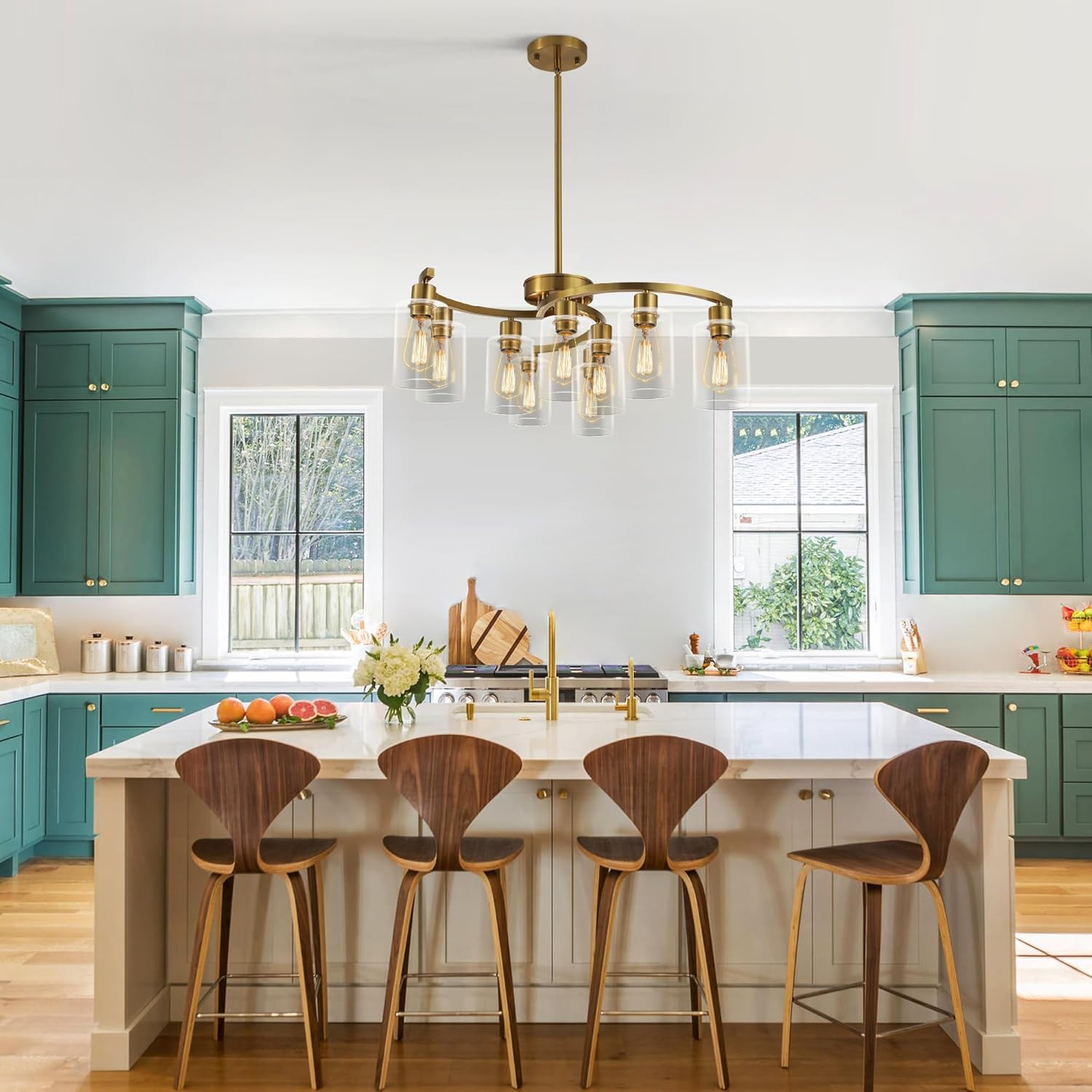 9-Light Gold Glass Chandelier, Adjustable Height Dining Room Light Fixtures Over Table, Contemporary Hanging Chandelier for Kitchen Island Living Room Foyer Office, Clear Glass Shade