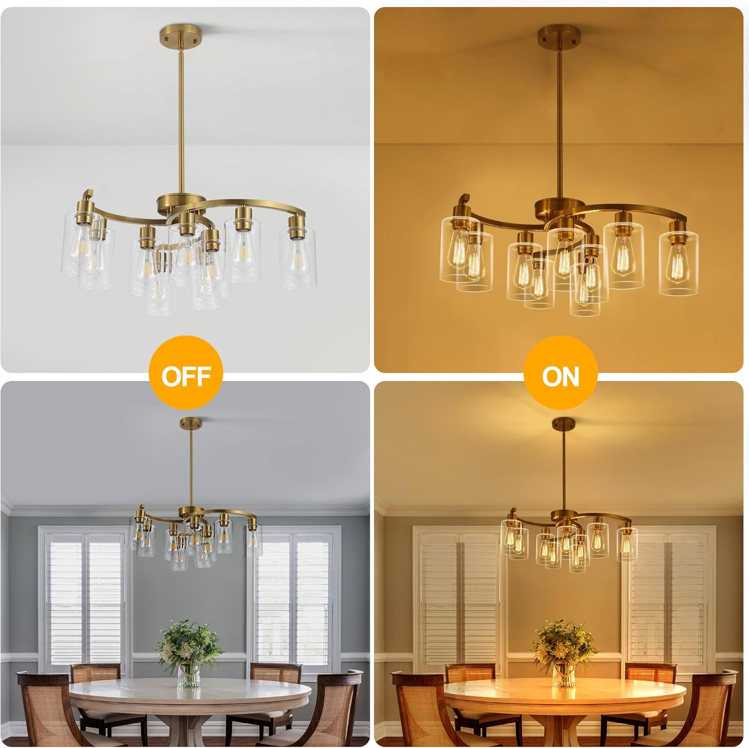 - [Modern Style]: Gold chandelier light fixture has 3 arms that radiate outward from the central arc, presenting a simple but not simple beauty. The body of the modern farmhouse chandelier is made of high quality metal with a fine polished surface and brushed. The clear glass shade not only ensures the soft scattering of light, but also complements the cold and hard texture of the metal, making the whole gold hanging light fixture both powerful and delicate. The downward-facing glass shade does not easily accumulate dust and is easy to clean.