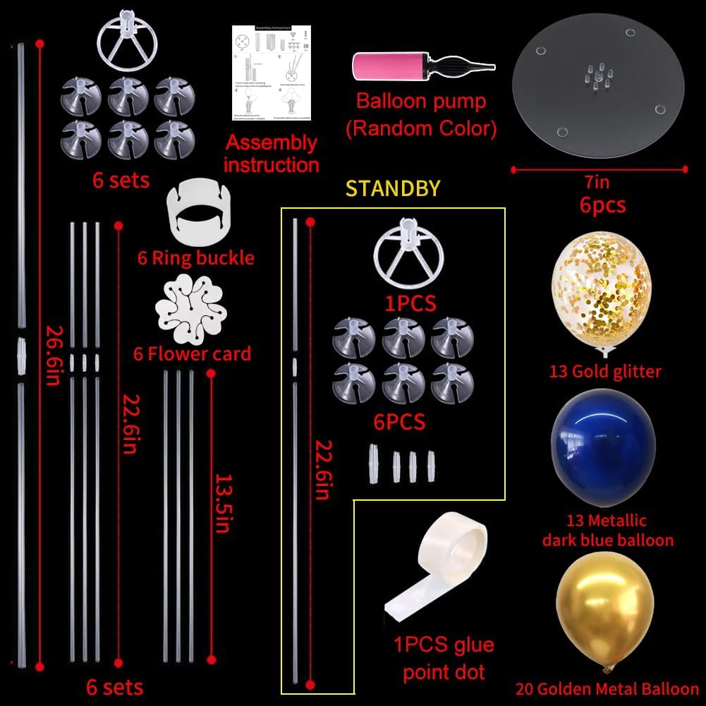 - Package Includes: The balloon stand kit includes 6 reusable balloon centerpiece table decorations and 12 inch 48pcs Latex Balloons(21 gold balloons,15 navy blue balloons,12 gold confetti balloons),glue point dots,balloon pump,balloon clips,and tie tool.You don’t need to waste money to buy balloons