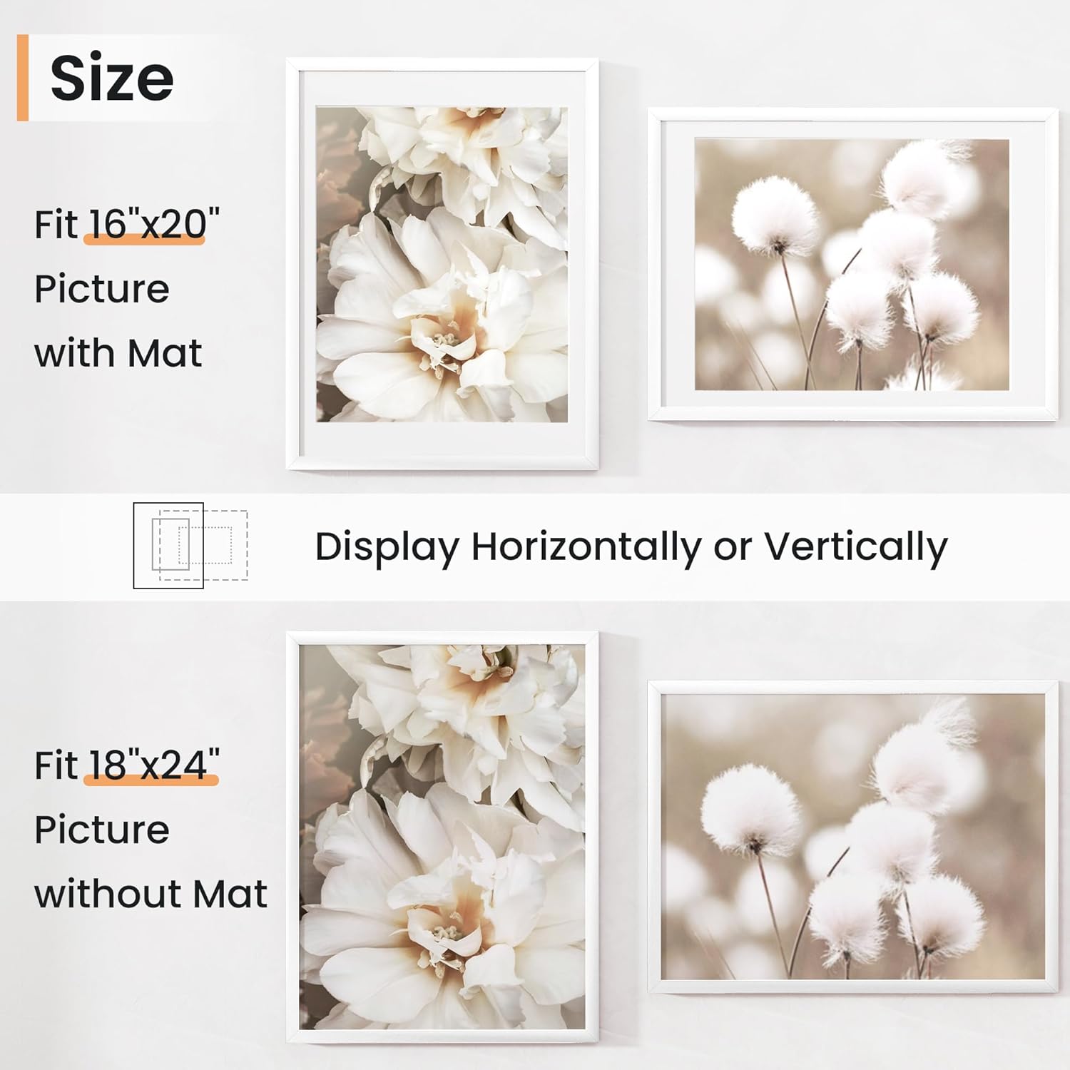 - Display Precious Memories - Showcase your cherished moments with our 18x24 plastic frame. It's lightweight yet sturdy with a superior quality finish. The white mat opening (measuring 15.5x19.5) is perfect for a 16x20 picture with the mat, or an 18x24 picture without it.