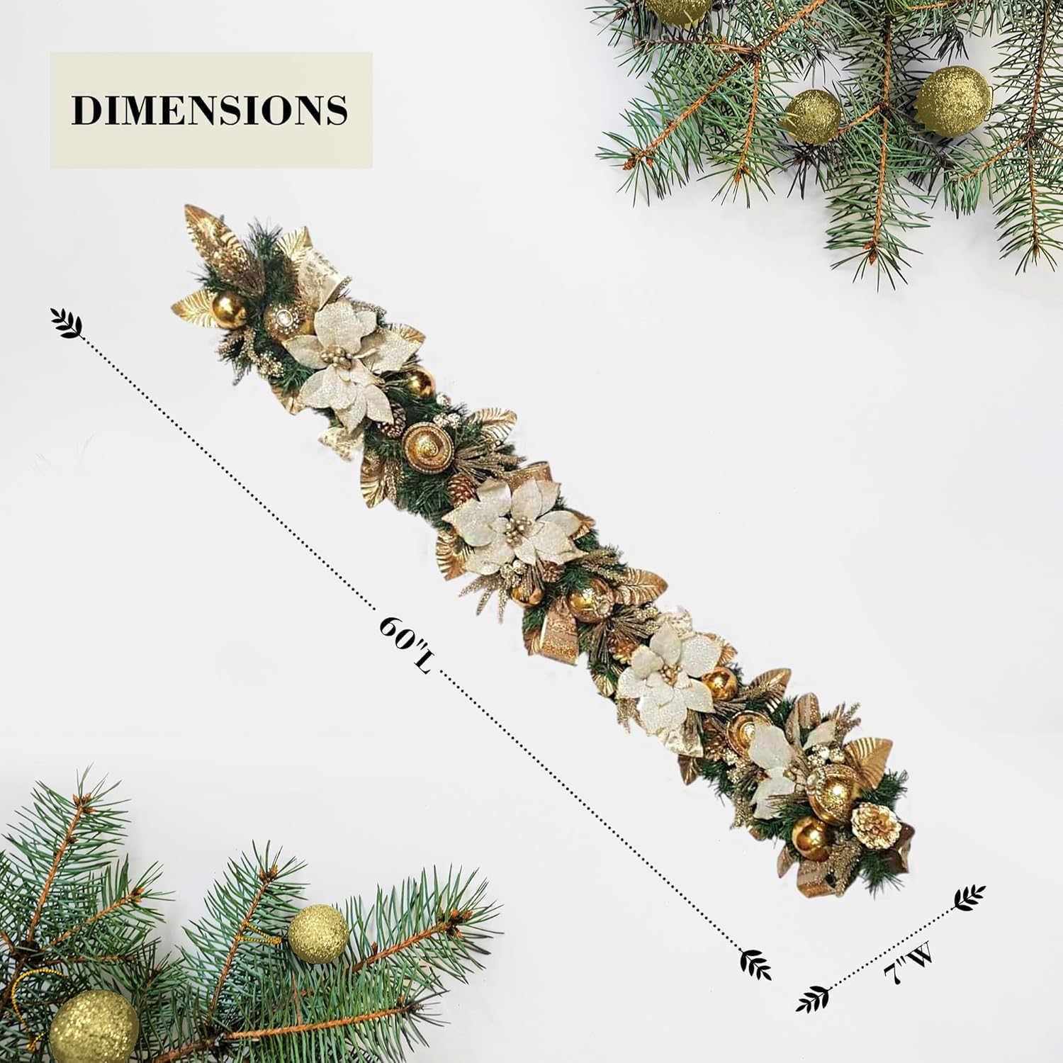 - LUXURIOUS DESIGN & SHIMMER - Features shimmering white poinsettias, gold accents, and lush greenery. This 5 ft garland brings a festive glow, creating a modern yet timeless look for your Christmas celebrations.