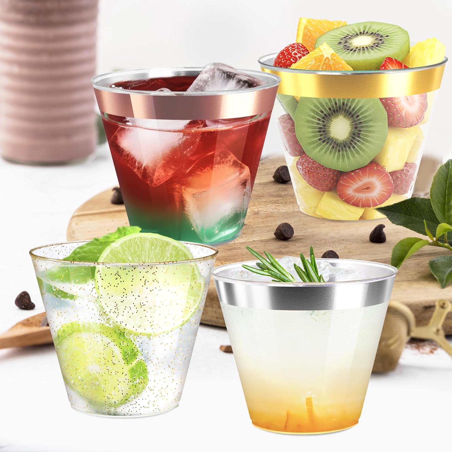 [200 Pack] 9oz Plastic Cups with Gold Glitter Sturdy & Food Safe Plastic Wine Glasses Disposable Cups Party Wedding Cups Cocktail Glasses for Wine, Juice & Cold Beverages