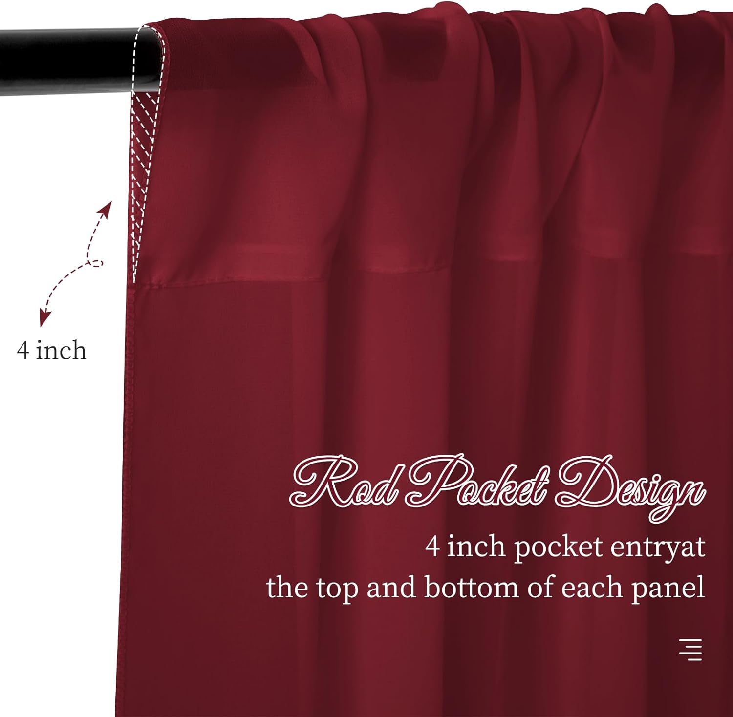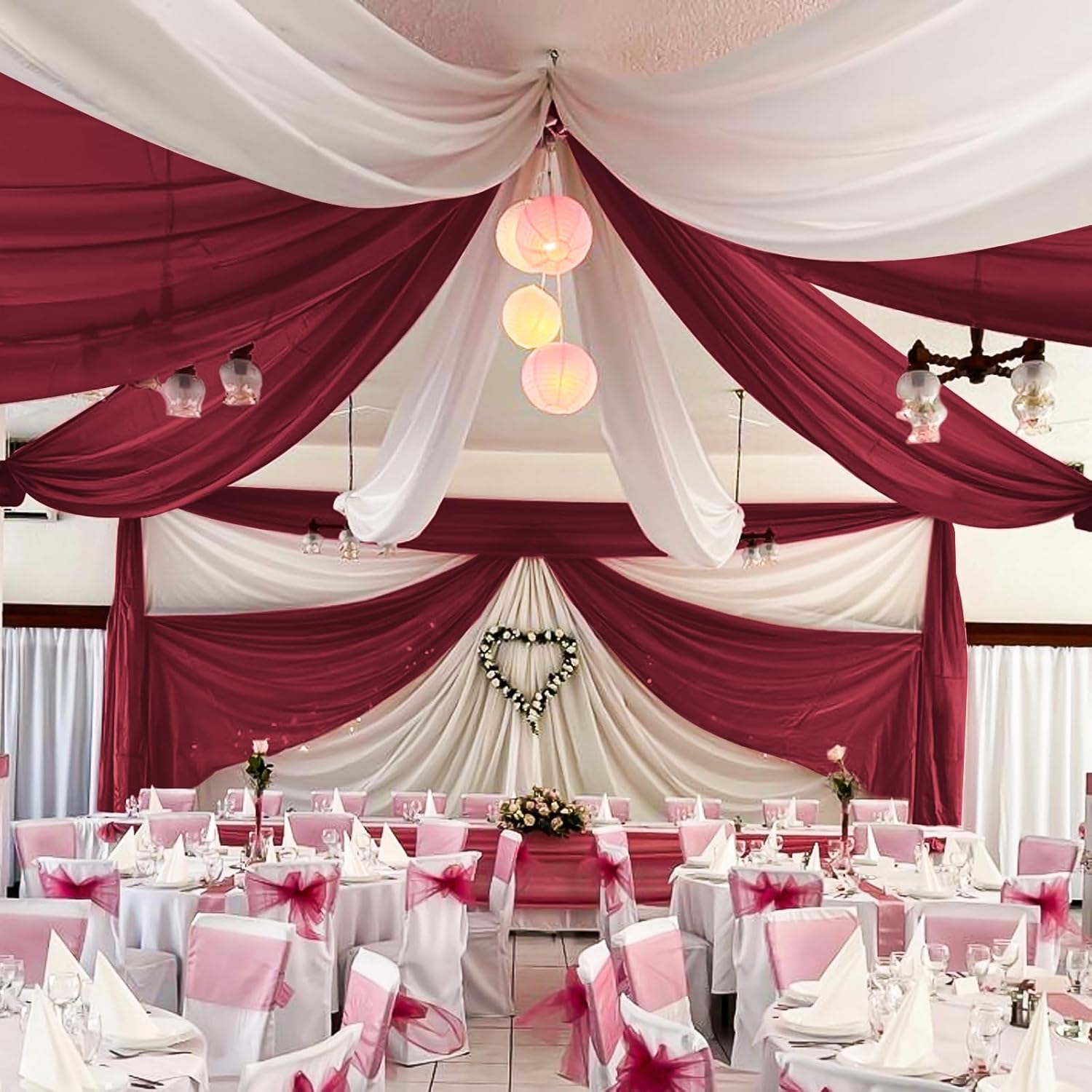 - Romantic Sheer Arch Drapes: The wedding ceiling curtains are finished with firm and exquisite stitching in all margins, which are airy and lightweight; here is a 4 inches pocket for rod or pole entry at the top and bottom of each panel creating beautiful draping. This sheer ceiling is also called as wedding decorations for ceiling, chiffon draping, tent draping fabric for wedding, event draping fabric, wedding wall covering, burgundy stage curtains, etc.