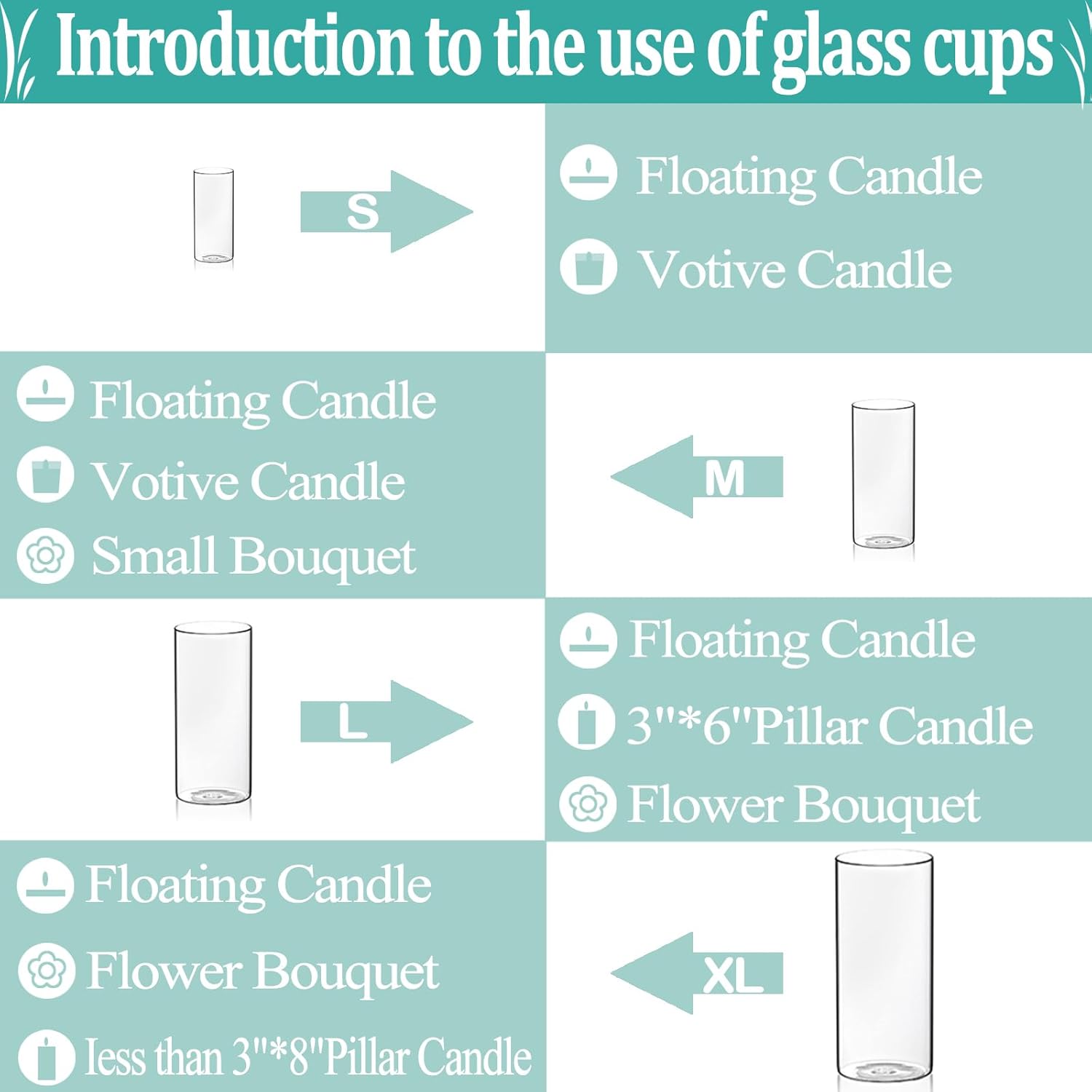 - Versatile Decoration : place floating candles on the water and light up to get a delicate and beautiful desktop center decoration.the clear cylinder vases bulk also can act as flower vases, pillar candle holders, floating candle holders, table centerpieces, storage containers for green plants, succulents, stones and so on.