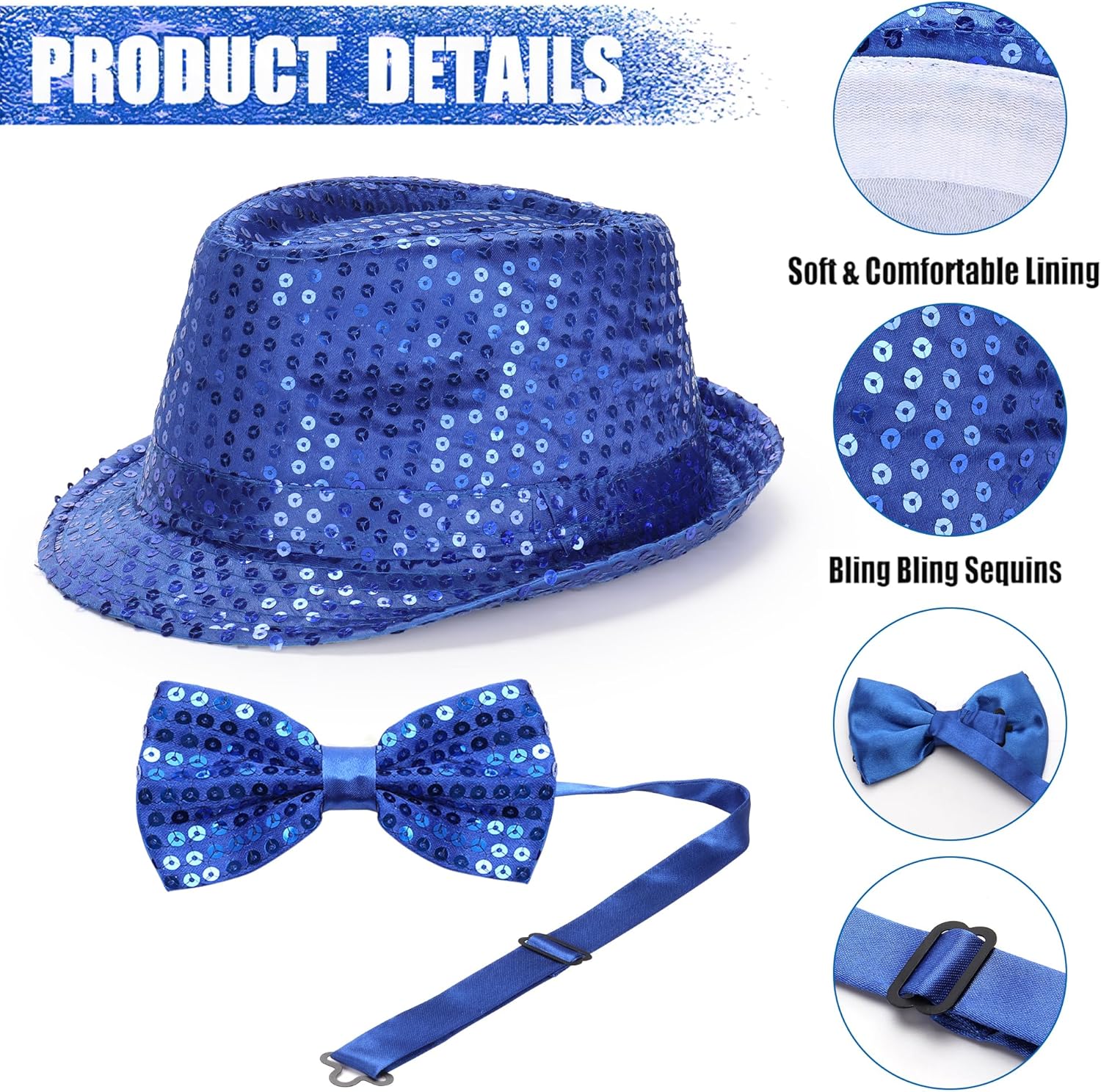 10 Pcs Unisex Sequin Fedora Hat Sequin Bow Ties Set Bling Retro Dance Jazz Cap Funky Party Costume Fedora