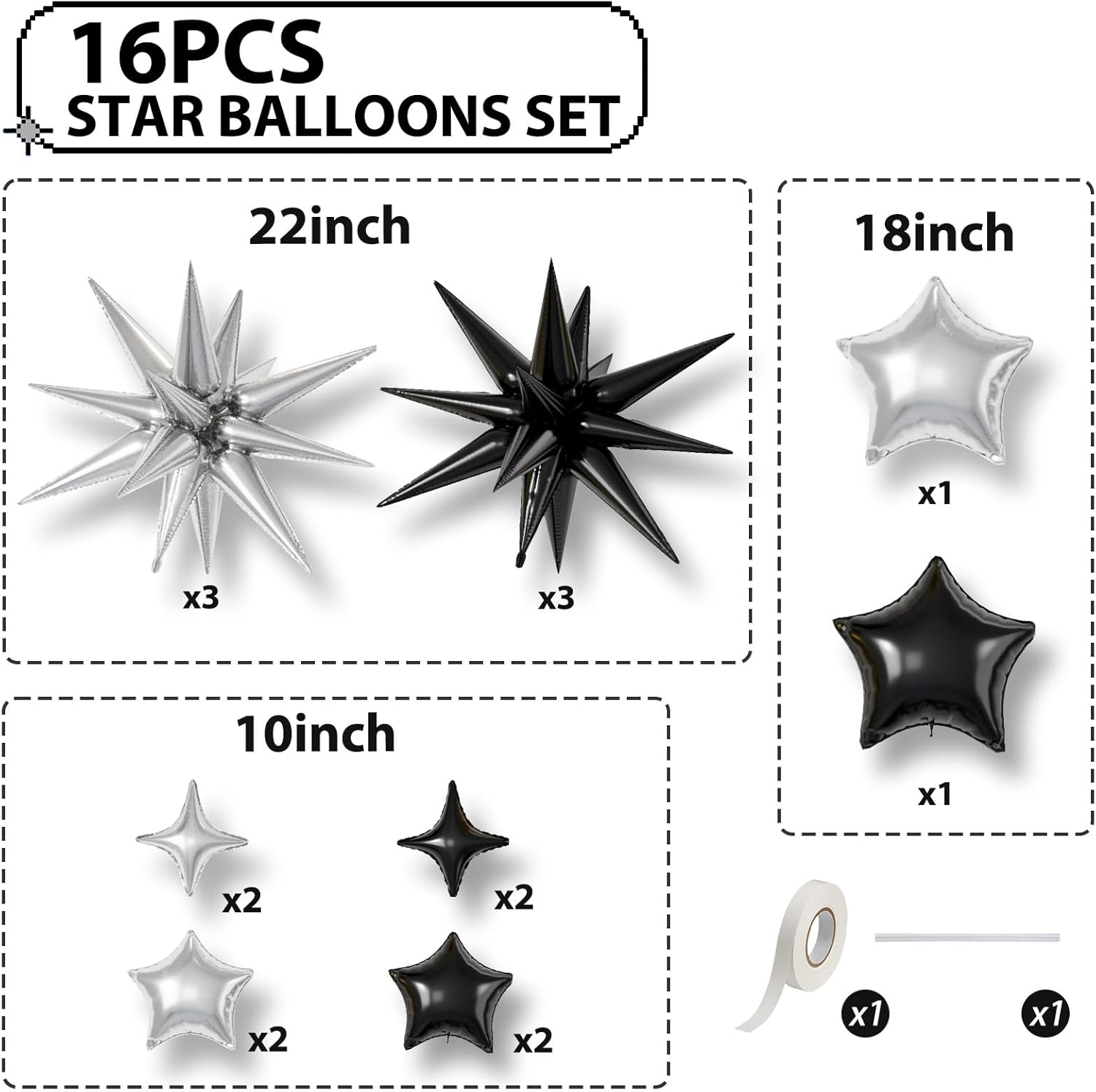 16 Pcs Black Silver Star Balloons,22/18/10 Inch Foil Balloons, Four-Pointed Balloon for Birthday Graduation Anniversary Wedding Baby Shower Party Decorations