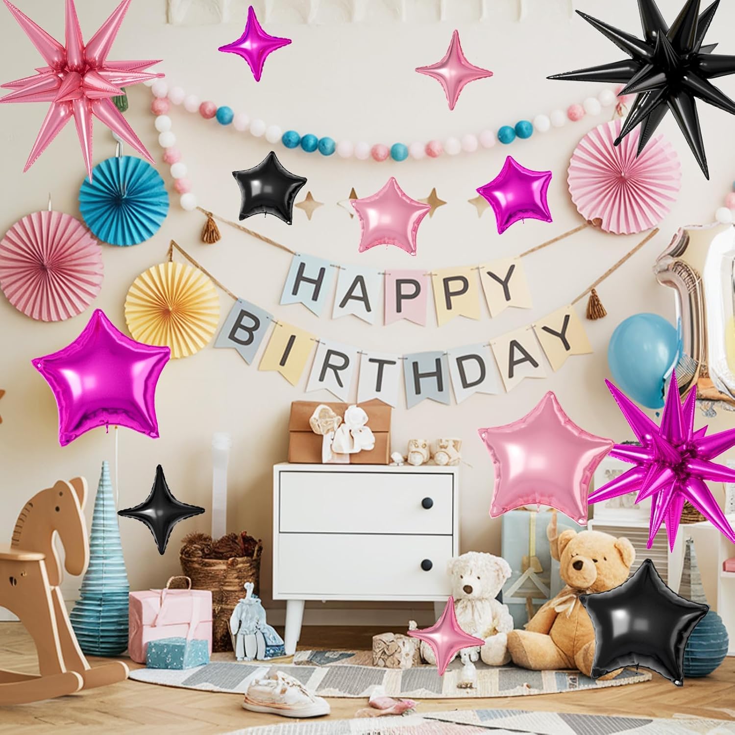 16 Pcs Black Hot Pink Star Balloons, 22/18/10 Inch Foil Balloons, Four-Pointed Balloon for Girl Mermaid Birthday Graduation Wedding Baby Shower Magic Party Decorations