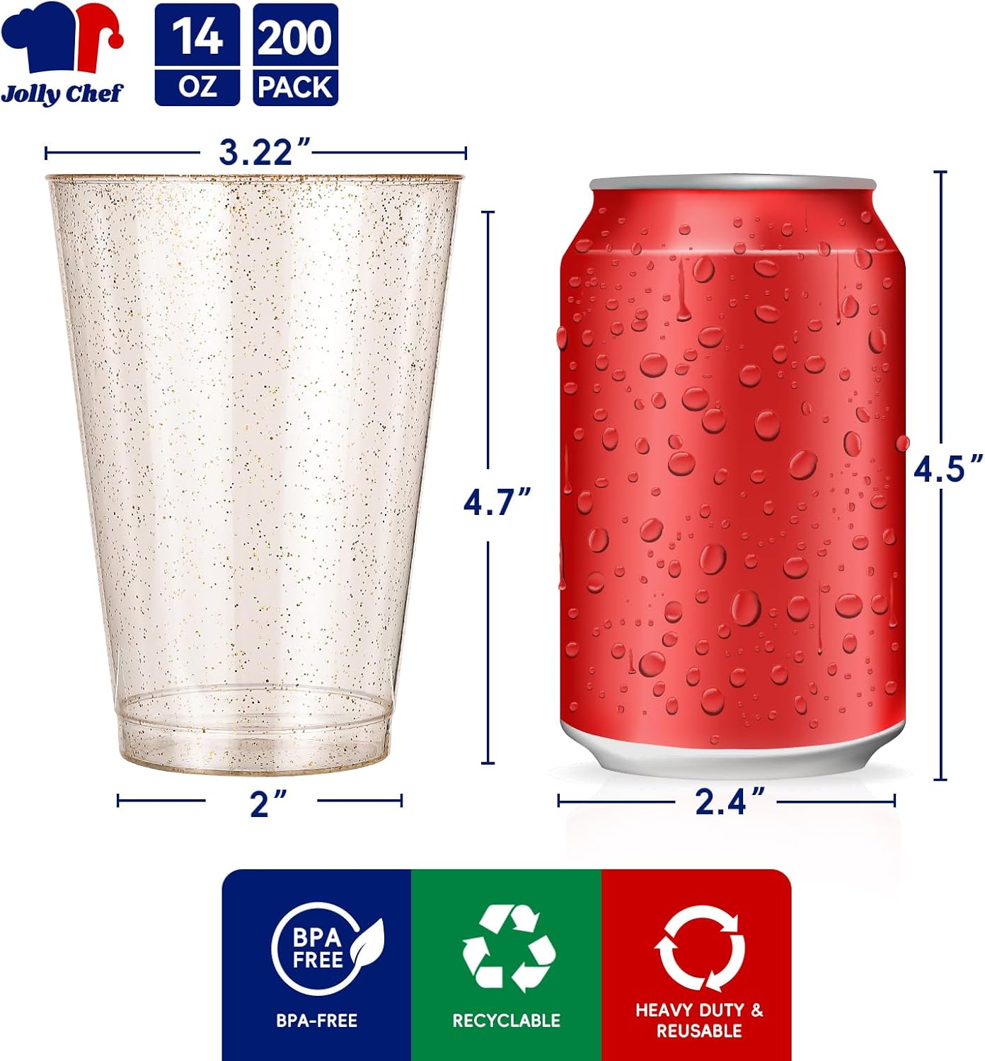 JOLLY CHEF 14 oz 200 Pack Gold Plastic Cups, Gold Glitter Heavy-Duty Disposable Cups Party Cups Tumblers, Ideal for Wedding & Party