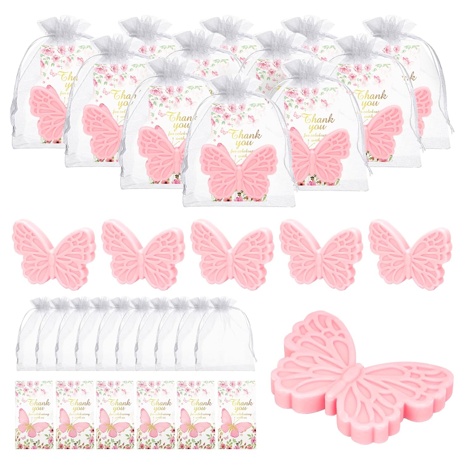 - Complete Baby Shower Combinations: The butterfly baby gift set we provide for guests includes 50 pink butterfly soaps, 50 butterfly thank you cards and 50 white organza gift bags. With sufficient quantity and exquisite craftsmanship, it can meet your various party needs and leave a deep impression on family and friends.