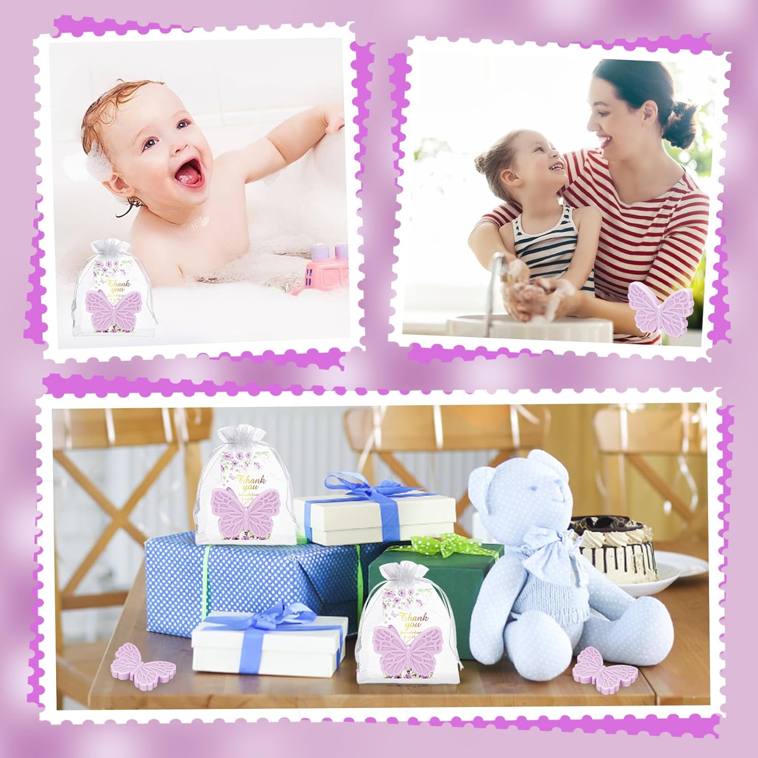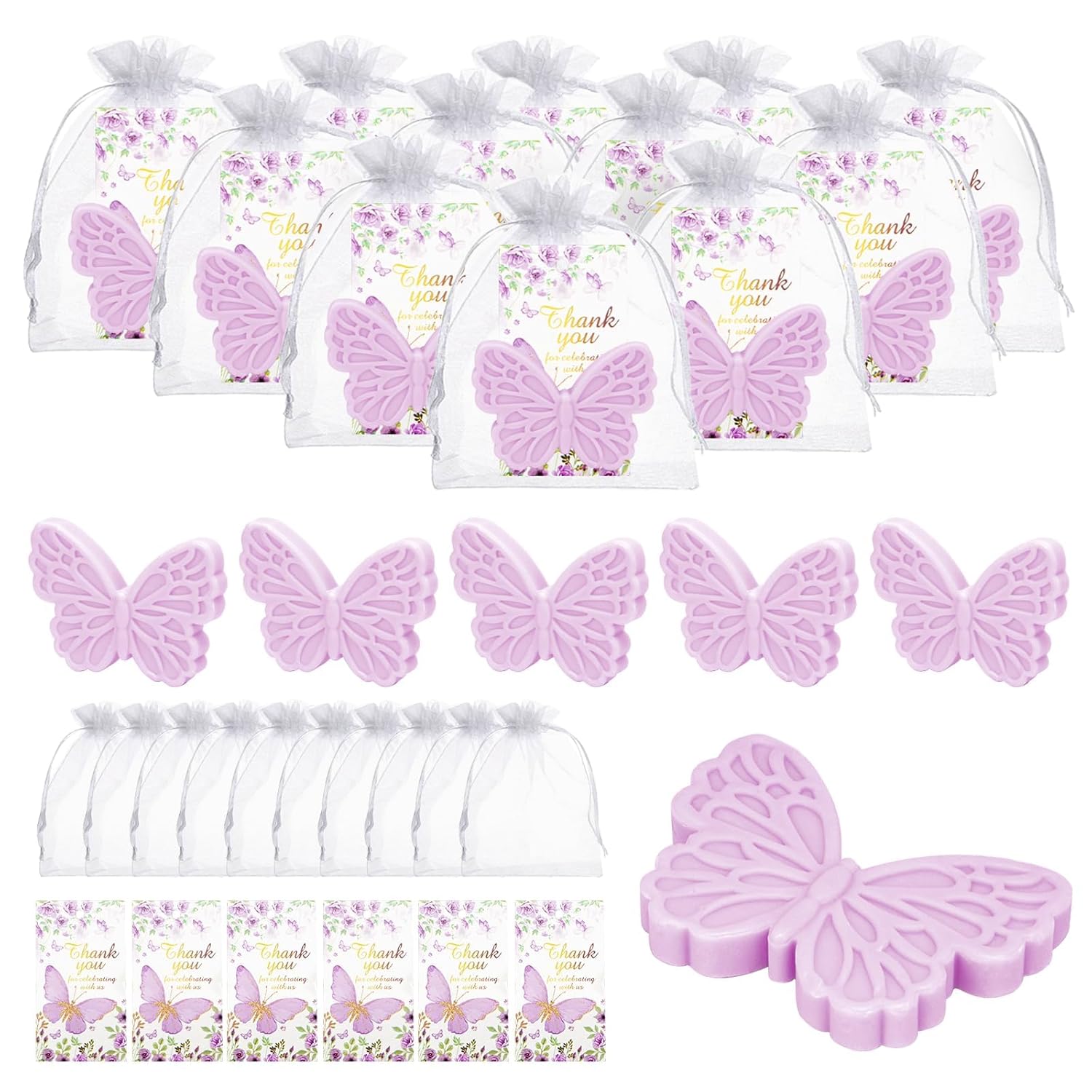 - Complete Baby Shower Combinations: The butterfly baby gift set we provide for guests includes 50 purple butterfly soaps, 50 butterfly thank you cards and 50 white organza gift bags. With sufficient quantity and exquisite craftsmanship, it can meet your various party needs and leave a deep impression on family and friends.