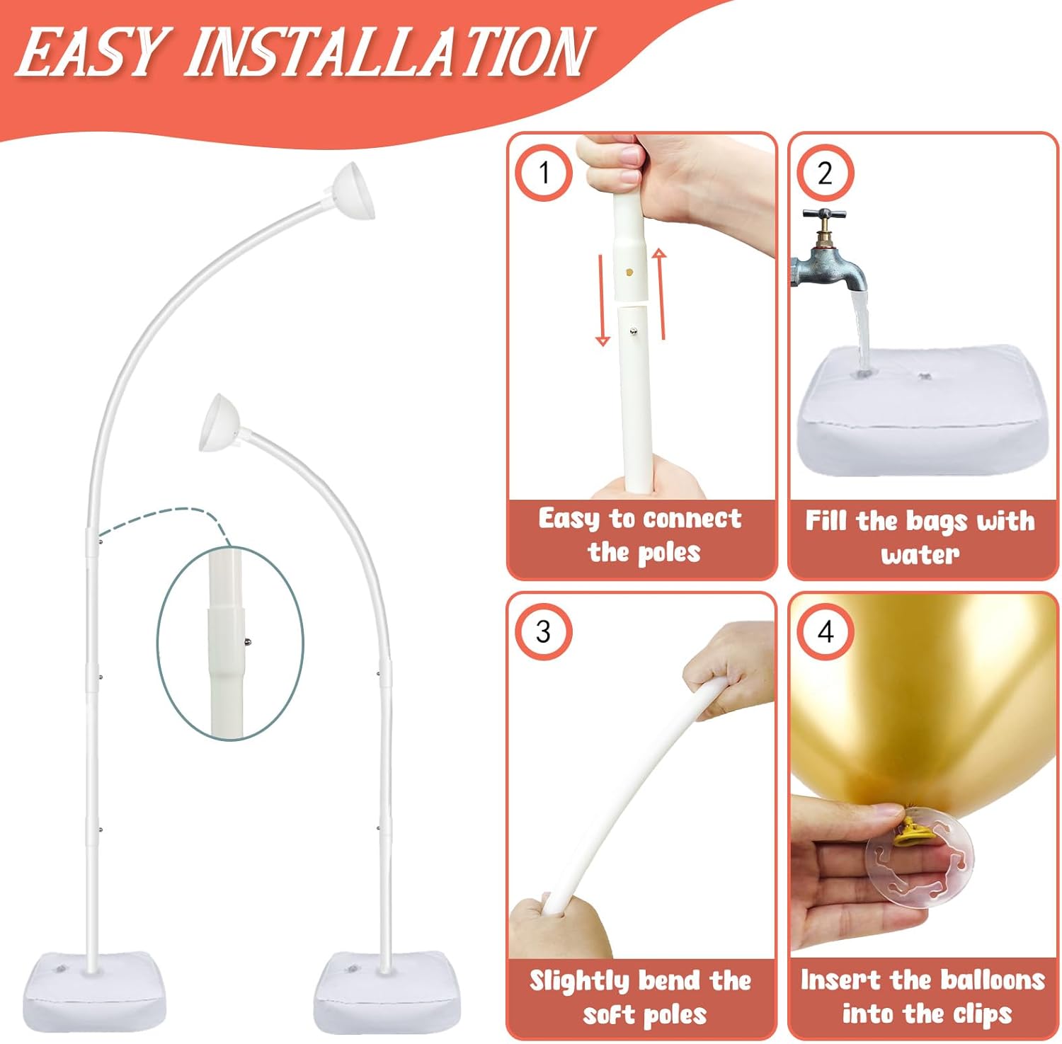 - 【Super Easy To Set Up】Our balloon arch stand with base features clear, step-by-step instructions for effortless assembly. Simply connect each tube and insert it through the buckle for a secure fit. Each water bag for the balloon arch backdrop stand weighs 15 pounds when filled, ensuring enhanced stability for the half arch balloon stand. Plus, the flexible top tube can be easily bent into any shape you desire to perfectly complement your party theme.