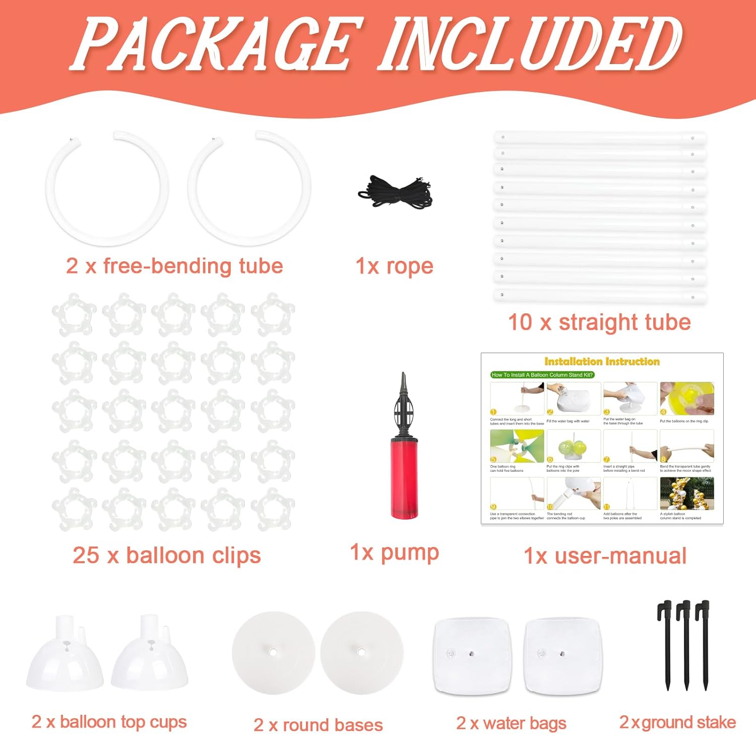 - Included Components : 10 straight tubes, 2 free-bending top tubes, 2 balloon top cups, 2 round bases, 2 water bags, 25 balloon clips, 1 pump, 1 tether, 3 ground stakes and a user manual (balloon not included). 10 straight tubes, 2 free-bending top tubes, 2 balloon top cups, 2 round bases, 2 water bags, 25 balloon clips, 1 pump, 1 t… See more