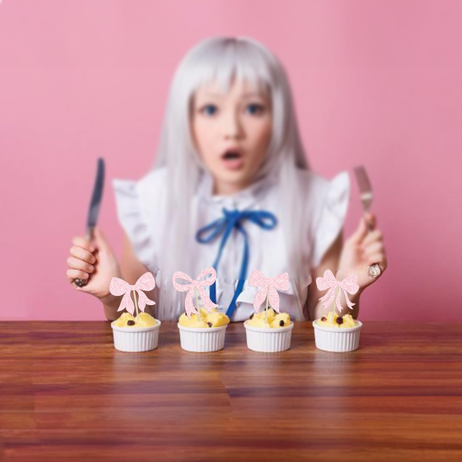 Gyufise 36Pcs Bow Cupcake Toppers Glitter Girls Birthday Decorations Bowknot Cupcake Picks Bow Tie Birthday Decorations Bow Cake Toppers for Bridal Baby Shower Bachelorette Party Supplies Light Pink