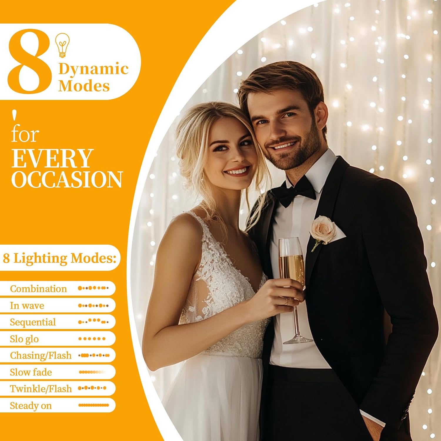 - Complete Event Decor Solution: Includes a 10 x 10 feet string of 300 warm white LED string lights with upgraded tangle-free PVC wiring. USB-powered with a 10ft cord, it’s compatible with adapters, power banks, or laptops. Choose from 8 lighting modes to create a magical and romantic atmosphere for any occasion