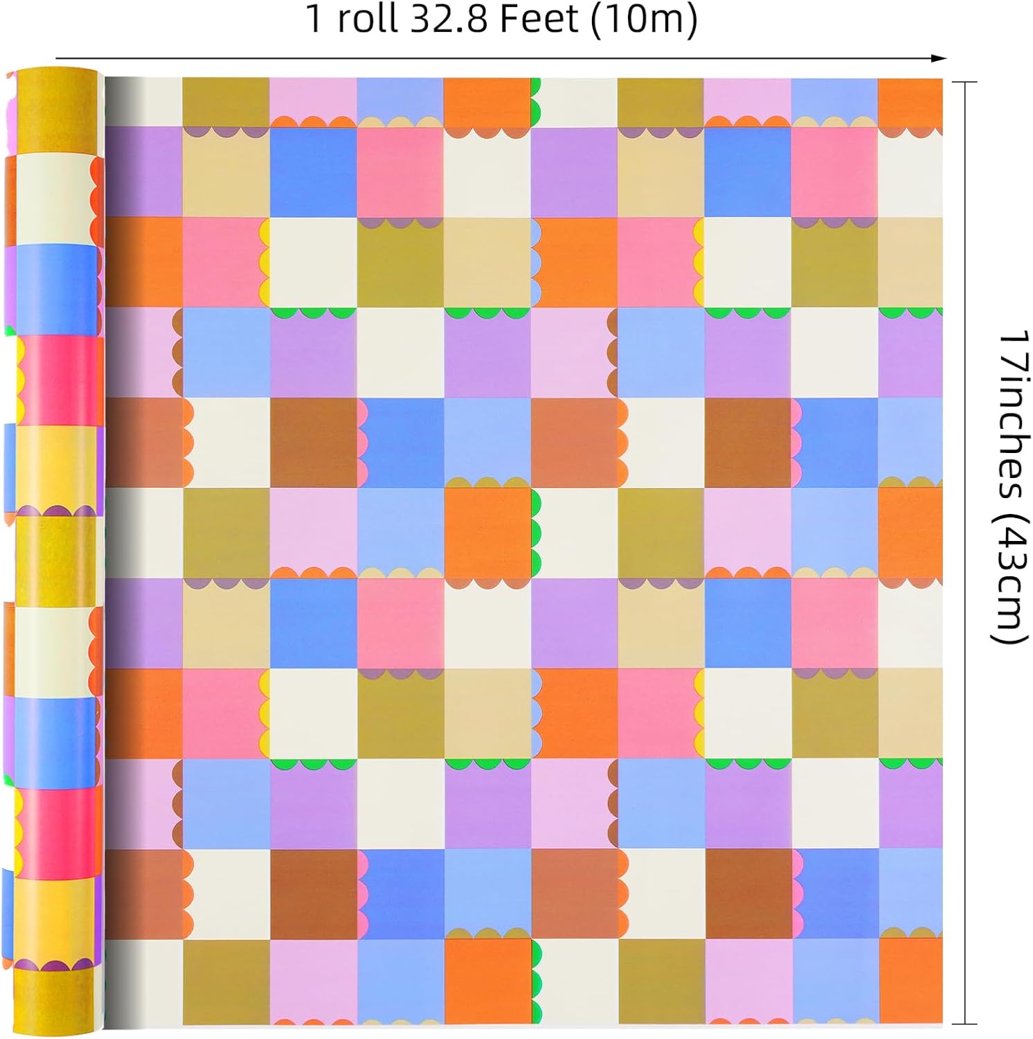 Ulmasinn Color Block Wrapping Paper Roll - 17 Inches x 33 Feet - for Girls Boys Kids, Colorful Square Patterned Gift Wrapping Paper with Scalloped Edges for Birthday Party, Holidays, Weddings