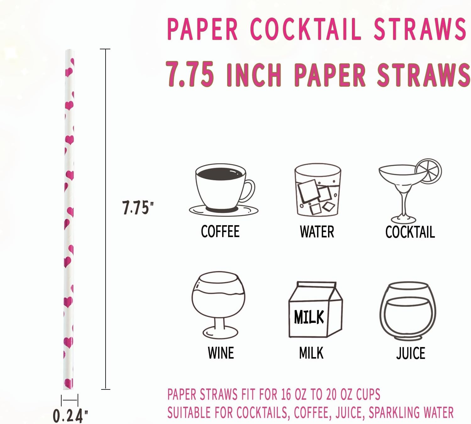 Paper Straws, Disposable Drinking Straws Biodegradable 7.75 inch,for Wedding Birthday Decorative Holiday Party Supplies - 100 Count, Foil Rose Pink Heart