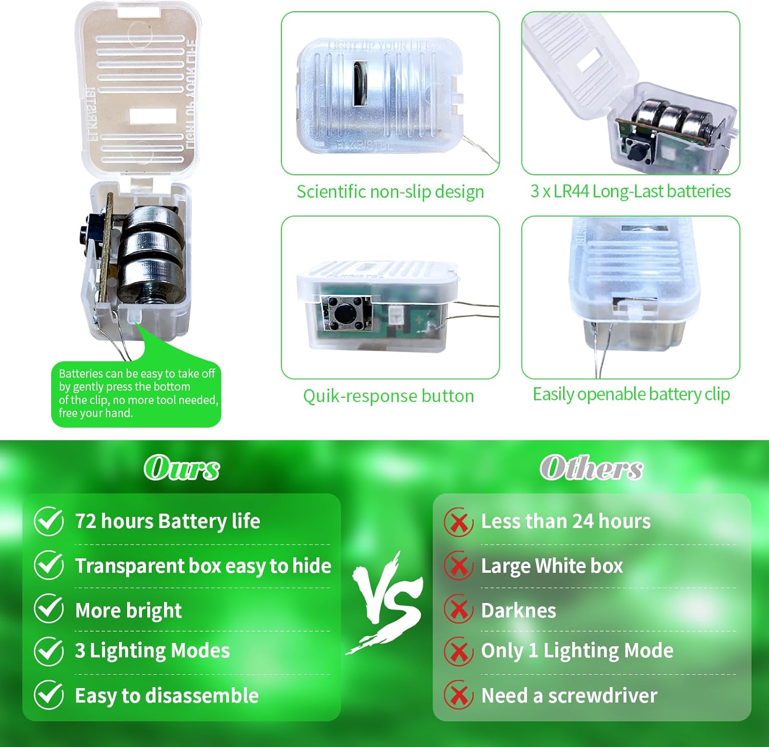 - UPGRADED DESIGH AND EASY TO REPLACE: The fairy lights' newest clear and small battery box is 0.78*1.28 inches in size, very easy to hide into all your DIY projects. The upgraded battery pack has scientific non-slip design on both sides, which makes it feel comfortable and easy to catch. Batteries are also very easy to take off, no more screwdriver needed, just gently press the bottom of the clip to open, free your hand