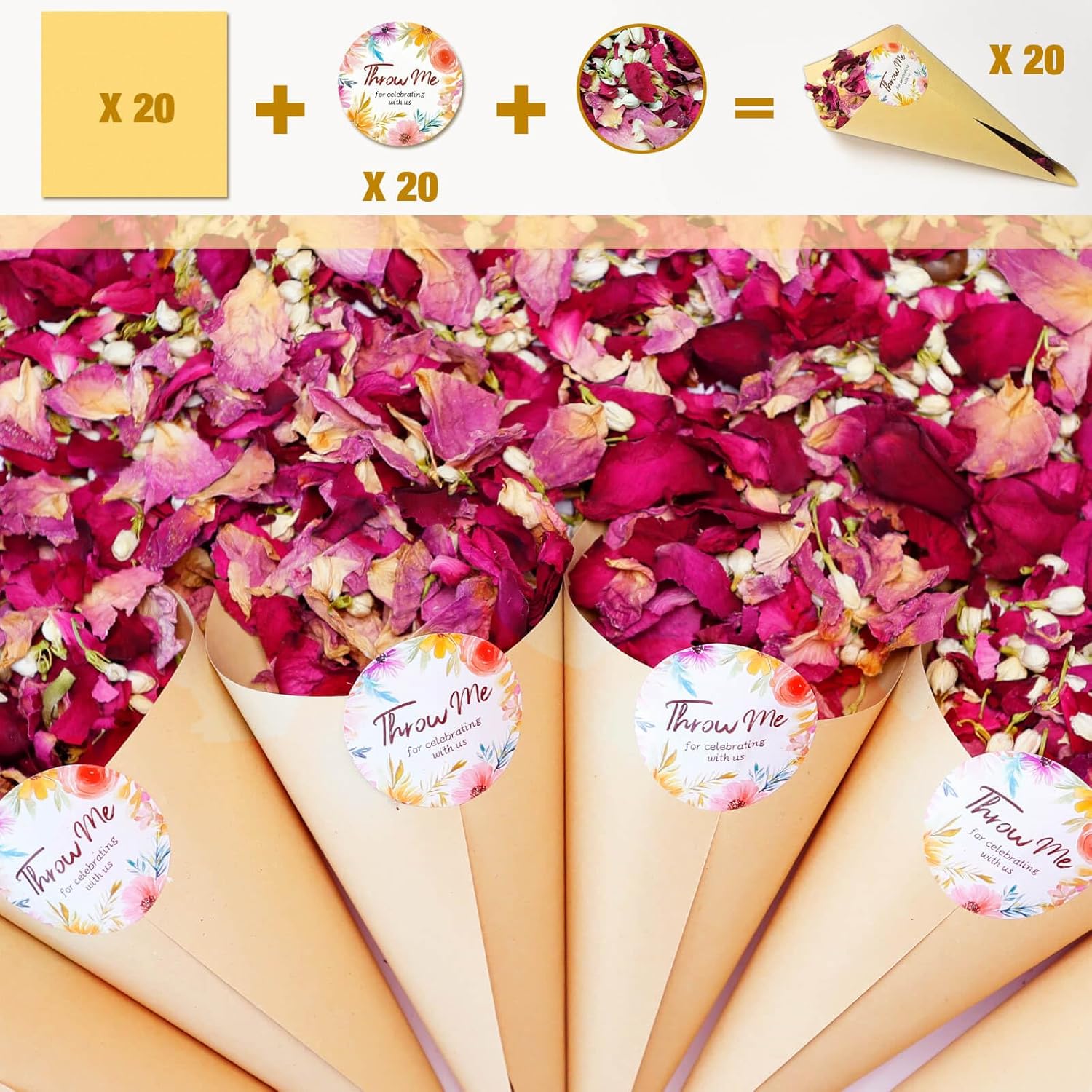 - Perfect Match: Each package contains 2 QT of loose rose petals, 20 pcs paper cones and stickers! Taken together you'll get 20 cups of petals. Whether you need romance or color, our petals make every event memorable.