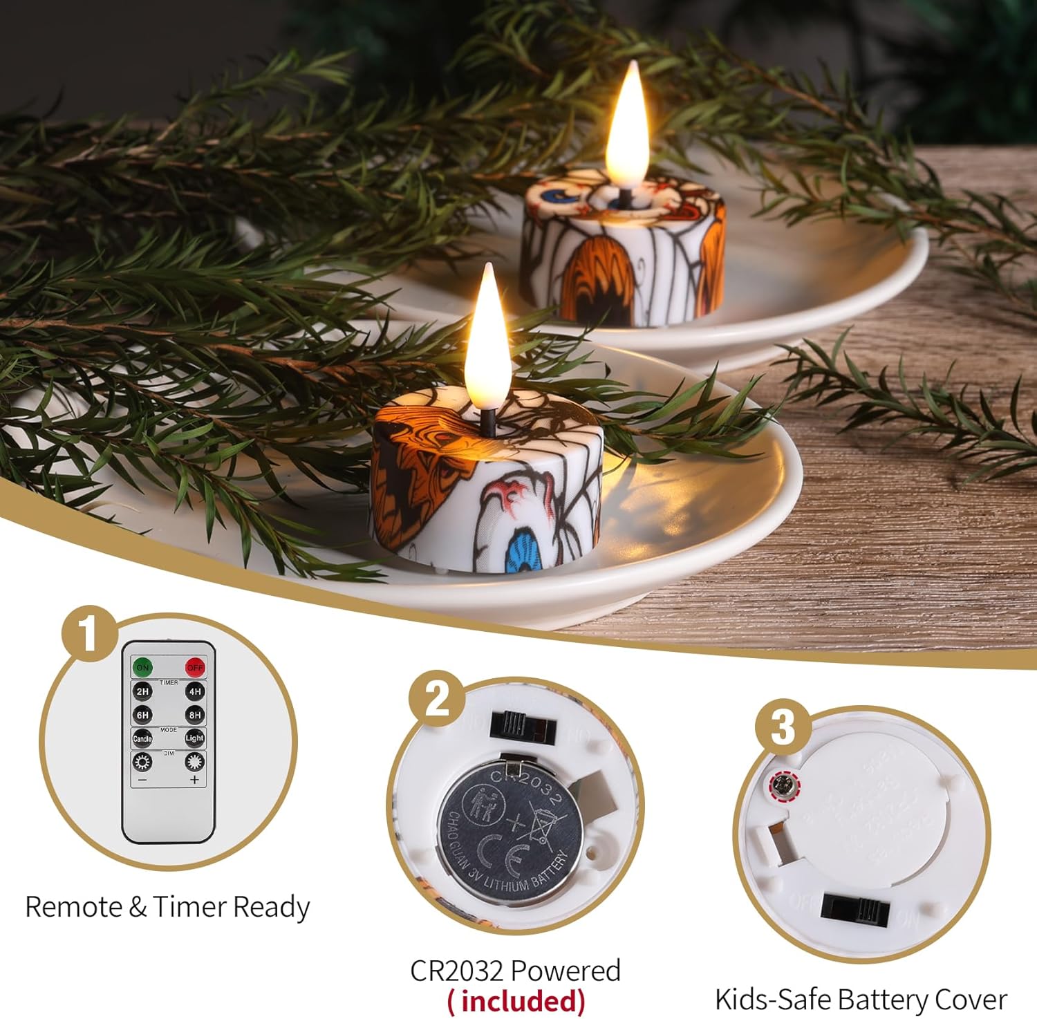 - Batteries Included: each white tea candle takes 1 cr2032 coin cell (included), lasting over 150 hours, remote takes 1 cr2025 coin cell (included)