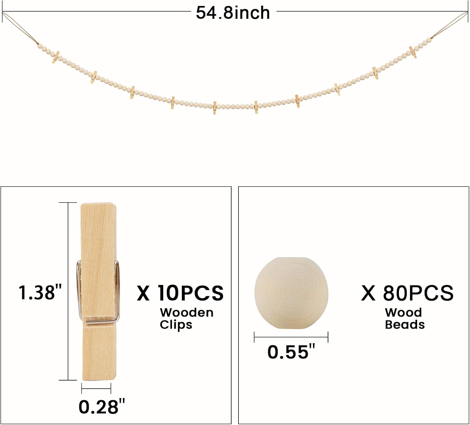 - The total length of wood bead garland is 54.8". Each garland includes 10 clips, you can give your custom wall art a makeover any time you want by simply removing or adding photos. Easily add some special to your beautiful bohemian home decor, sweet farmhouse decor, or modern minimalist style