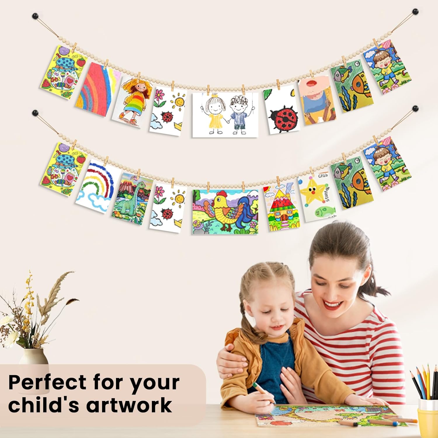 - This hanging photo display is hand-made with natural wooden beads and jute rope, durable, corrosion-resistant and non-toxic, not easy to break and fade. Natural wood beads have a polished finish that is smooth. You can paint and color it to complete your personalised decoration.