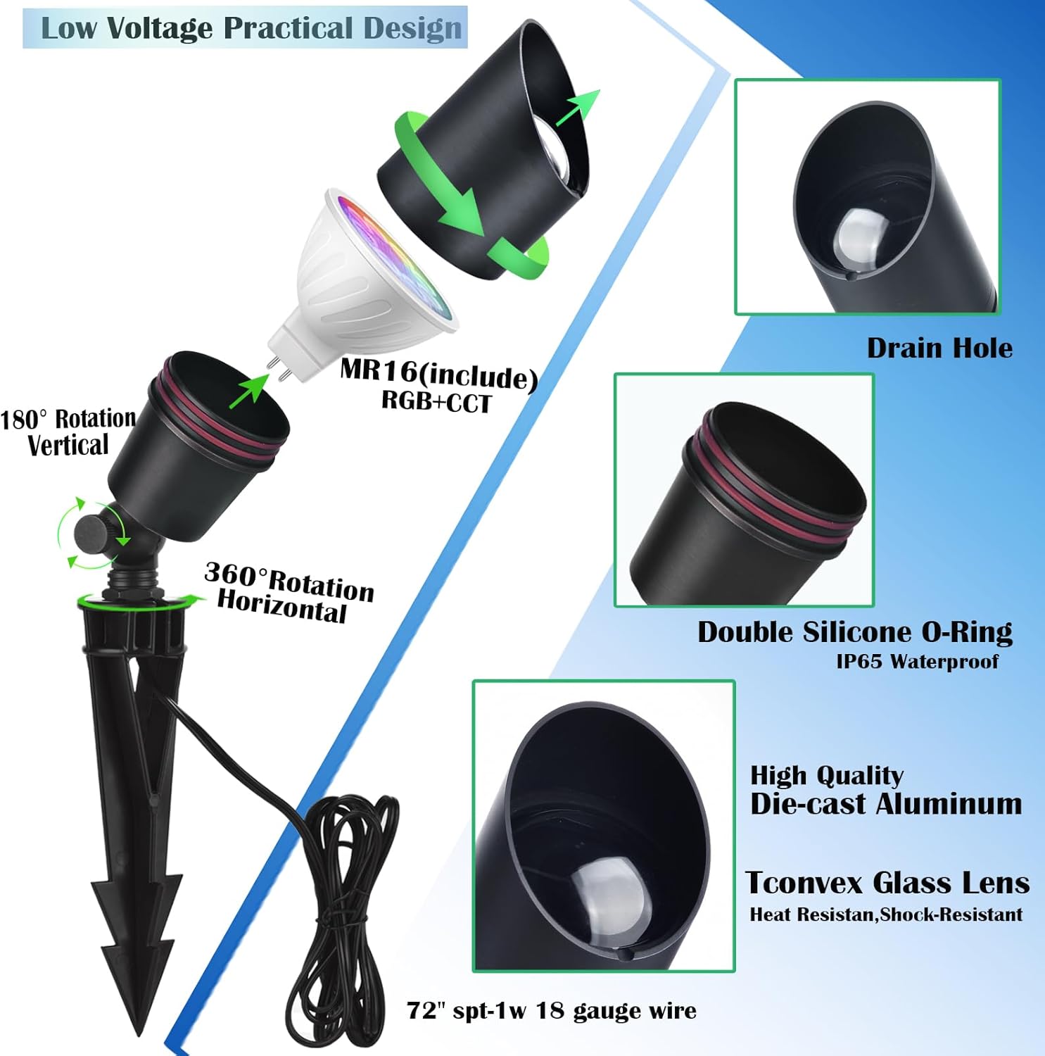 - 5.360° Rotational Spotlight with Heat-Resistant Lens: Enjoy complete control with 360° horizontal rotation and 180° vertical rotation, allowing you to direct the landscape light to any angle without needing to move the fixture. The high heat-resistant curved glass lens and aluminum of low voltage lights prevent water condensation, ensuring clear, consistent lighting performance in all weather conditions.
