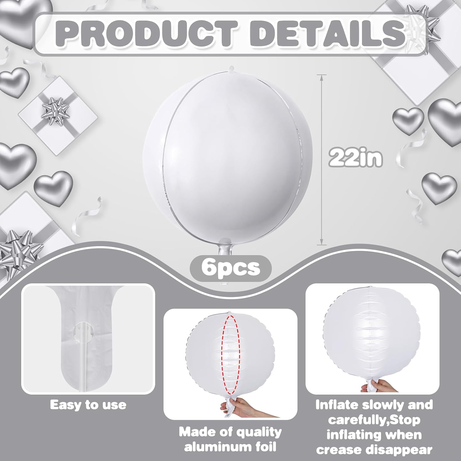 - 【6PCS ROUND BALLOONS】package include 6pcs 22inch white round giant 4D foil balloons. The white round balloons are large enough to help you better decorate your party.