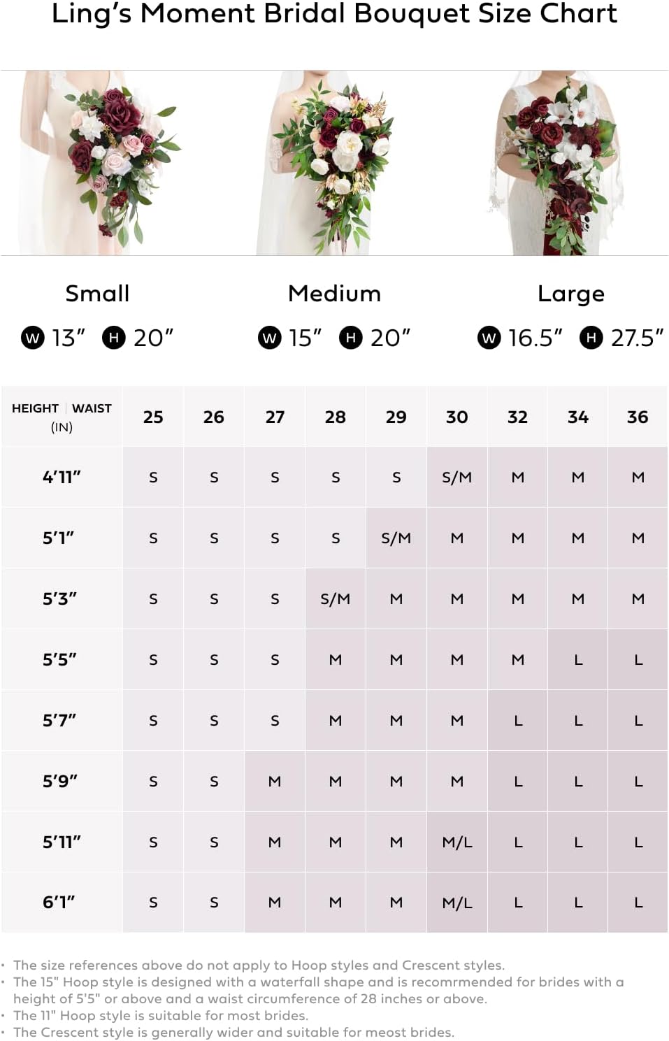 - Size: This Wedding Bouquets for Bride is approx. [13 inches W x 20 inches H]. Handle length 4.3inch. With ribbons card. This size is typically suitable for most brides to carry, this one is recommend for 4'11"-6'1"height and 25" waist, 4'11"-6'1"height and 26" waist, 4'11"-5'7"height and 27" waist, 4'11"-5'3"height and 28" waist, 4'11"-5'1"height and 29" waist, 4'11"height and 30" waist.