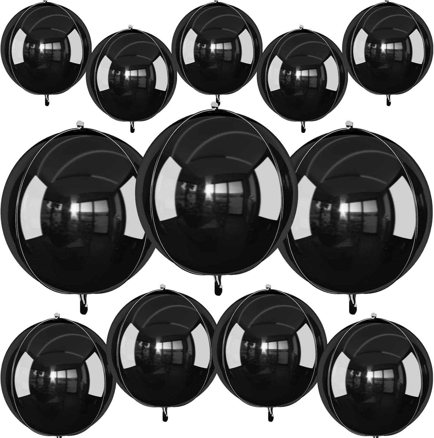 - Package: You will receive 12pcs 4D black round foil balloon, 3pcs 22inch + 4pcs 15inch + 5pcs 10inch + 1 straw + 1 roll of ribbon. Different sizes balloons in can meet your party needs. 10inch mini size balloons do not support helium filling and floating. The classic solid black chrome balloons are perfect for any black-themed party.