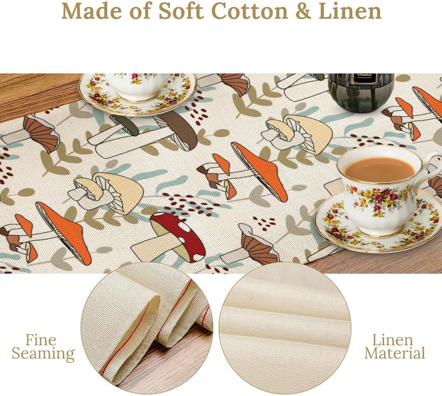 Mushroom Table Runner, Vintage Nature Plant Table Runner for Farmhouse Kitchen Dining Table Decoration for Home Party Decor 13x72 Inch
