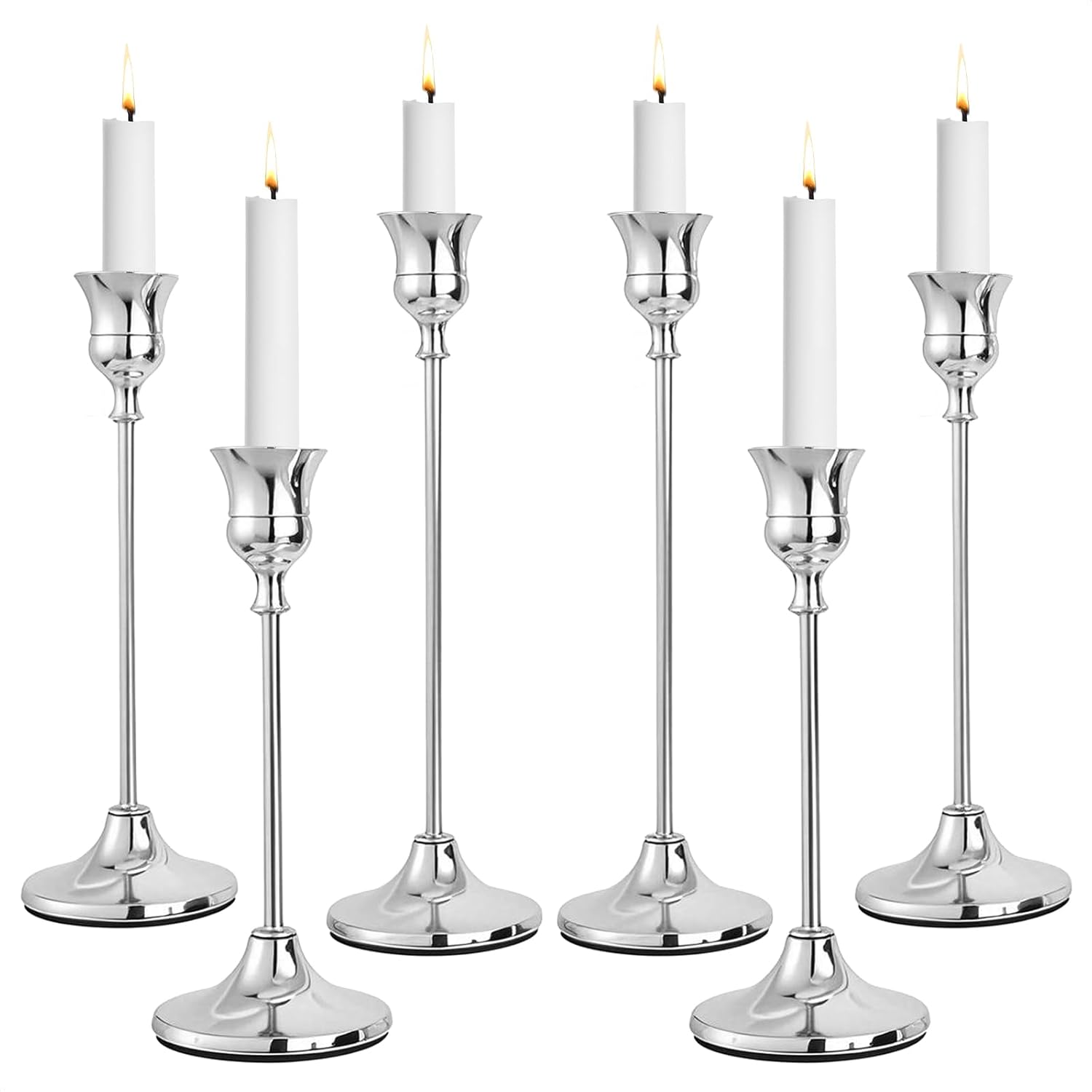 - [Elegant Set of 6 Silver Candlesticks]: Craft nice tablescapes with premium CHILL RECIPE silver candle holder set. Packgae includes three varying heights, 2x 6.7"(low size), 2x 7.9"(middle size), 2x 9.13"(high size).The diameter of base is 2.72"(6.9cm) wide. Notice candles are not included.