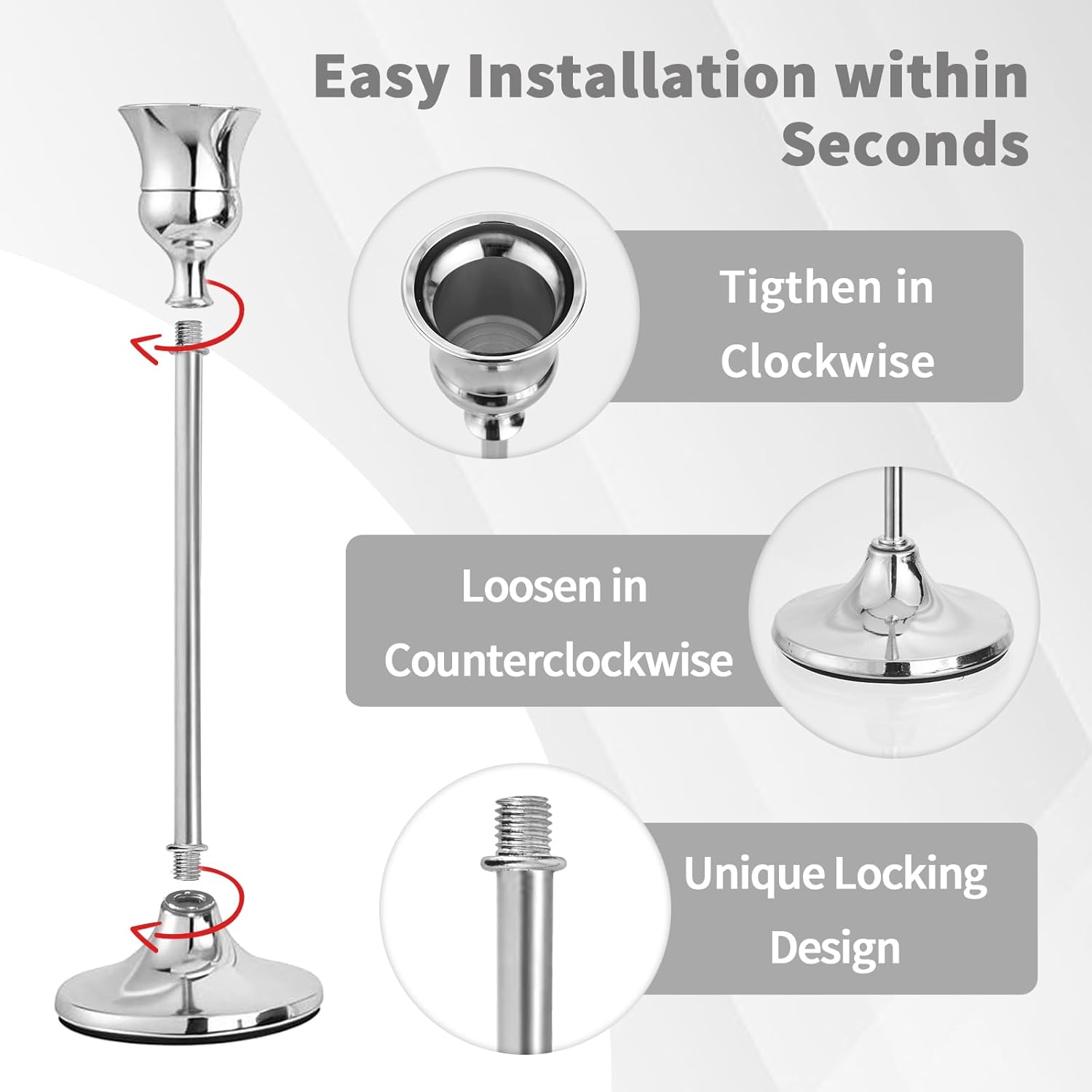 - [Stable Sturdy Secure]: Our tapered candle holder is made of high quality aluminum alloy material.The bottom of each candlestick holders is equiped with non-slip pads to increase friction while protecting your desktop from scratches and damage.It ensures stability and longer lifetime for your candles.Also we add metal ring to rod, which makes the installation more user-friendly and easier.