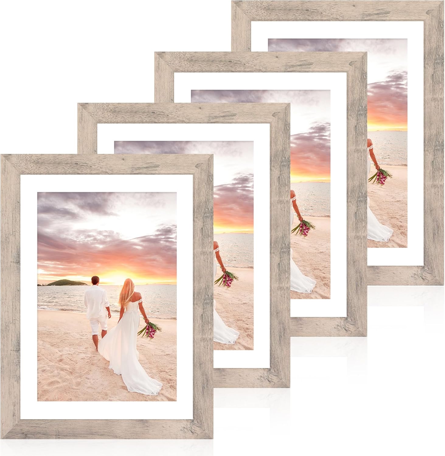 10x14 Picture Frame Set of 4 with Tempered Glass, Smoke Gray Frame Display 8x12 Picture with Mat or 10 x 14 Without Mat, Wood Rustic Photo Frames for Horizontal or Vertical Wall Mounting