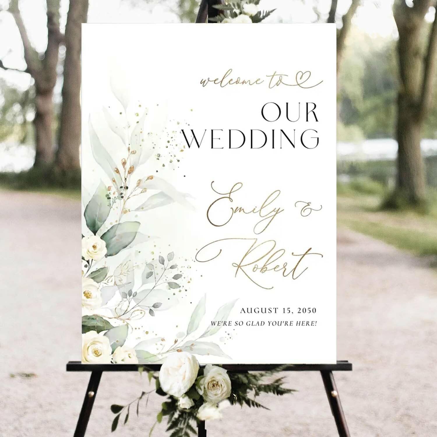 - This wedding sign features an elegant blend of lush greenery, delicate vines, and floral accents, creating a timeless and romantic ambiance. The nature-inspired design complements a variety of wedding themes, from rustic countryside celebrations to sophisticated garden receptions.