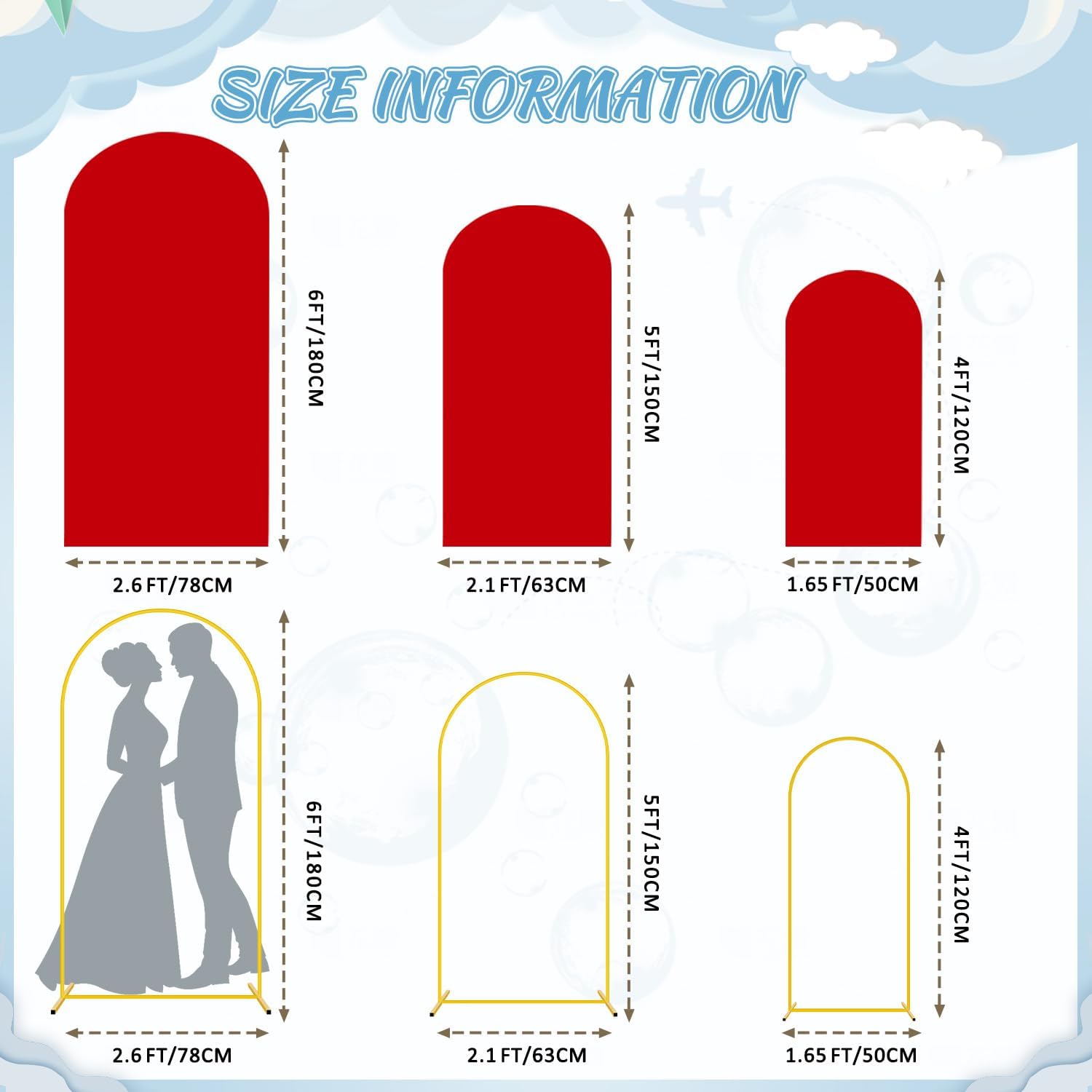 - 🧸【Size Information- Metal Arch Backdrop Stand and Cover Set】Arch stand and cover set includes 3 gold metal arch backdrop stands and 3 red spandex arch cover in sizes 6FT x 2.6FT(H x W), 5FT x 2.1FT(H x W) and 4FT x 1.65FT(H x W). The backdrop arch stand with cover is certain to meet your decoration needs and add a charming look to your celebrations.