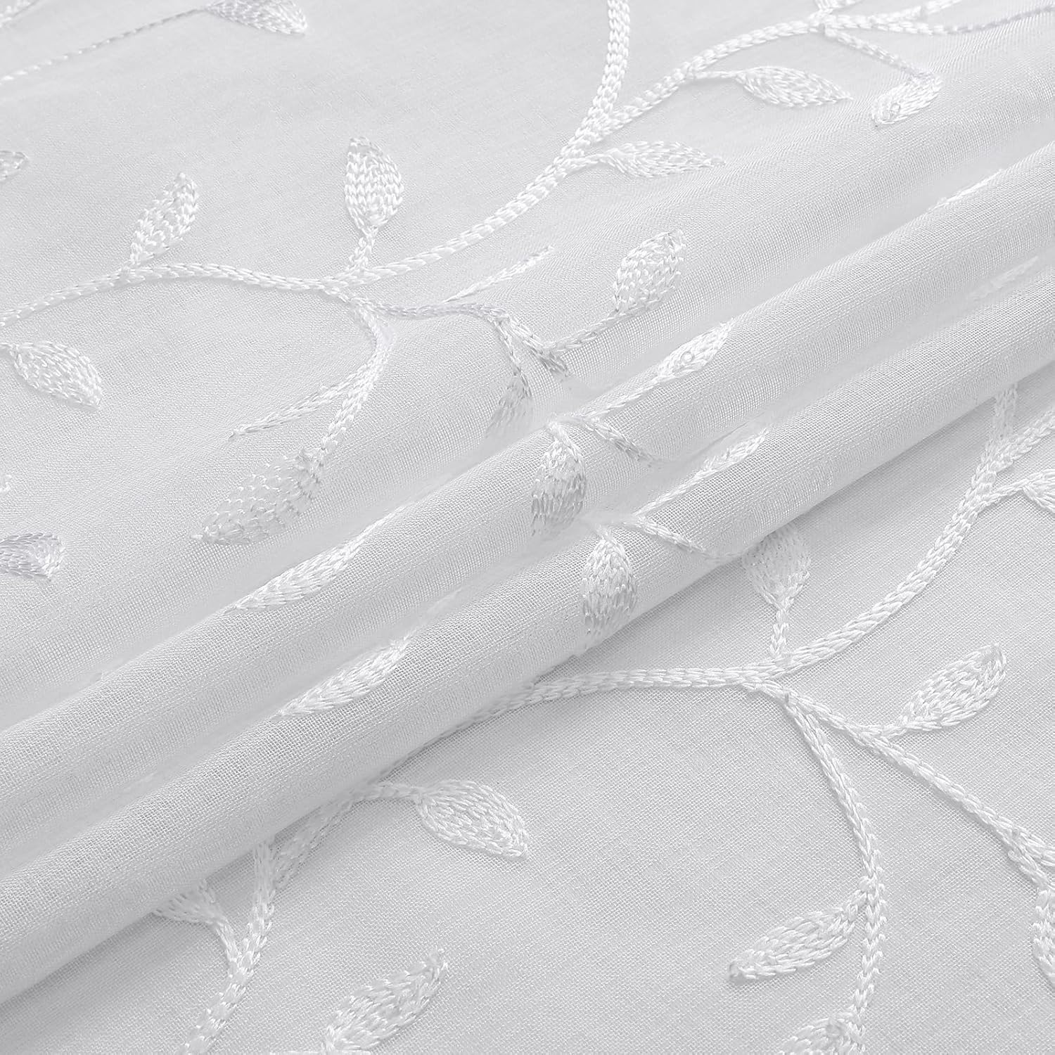 VISIONTEX White Sheer Voile Curtains, Decorative Leaves Embroidery Faux Linen Rod Pocket Window Drapes for Home Kitchen, Living Room and Bedroom 54 x 108 Inch, Set of 2 Curtain Panels