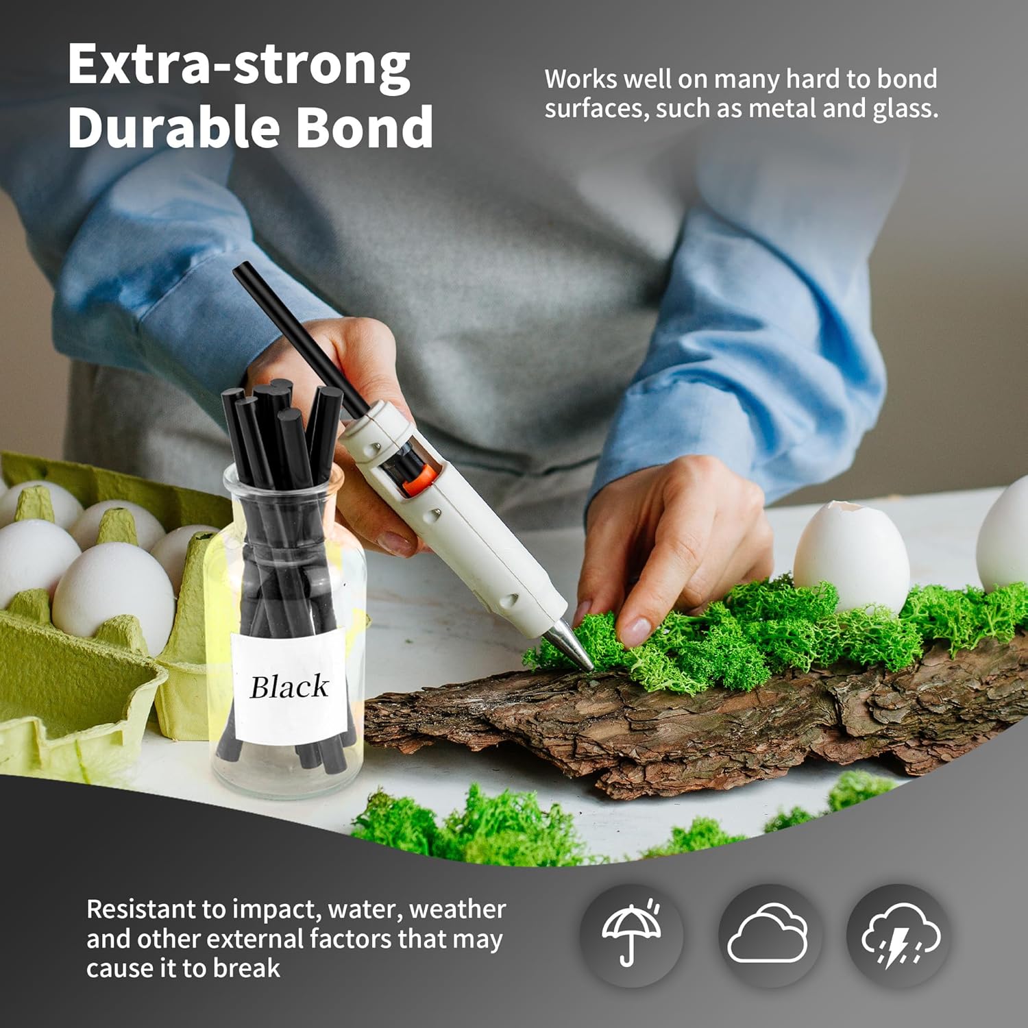 - Good Flexibility & Strong Adhesive - EVA hot melt glue has fast curing speed, strong adhesion, and certain toughness. Easily melts and adheres to most surfaces, Can be used on wood, Electronic component, stone, plastic,glass, ceramic, leather and metal etc.