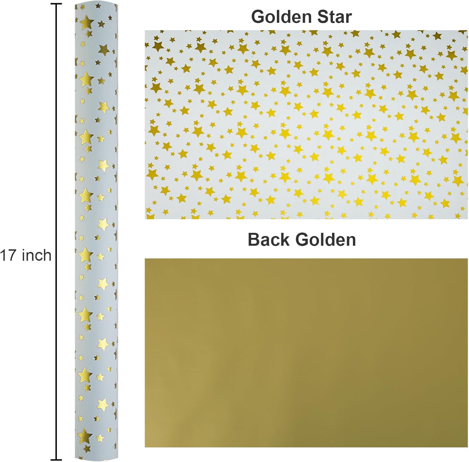 Burymento Gold Foil Five-Pointed Star Wrapping Paper, Reversible Gold Gift Wrap for Birthday, Valentines, Mothers day, Graduation, Wedding, Fathers day, Baby Shower, Christmas (17in x 32.8ft)