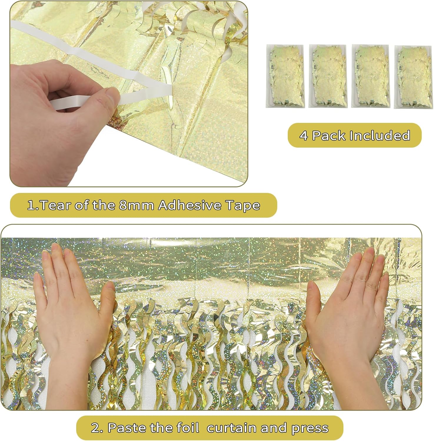 - Easy to Use: The champagne gold foil curtain backdrop has double-sided tape on the top of the back,please peel tape off would be very easy to paste on smooth surfaces such as wall,window,table,door or anywhere you like